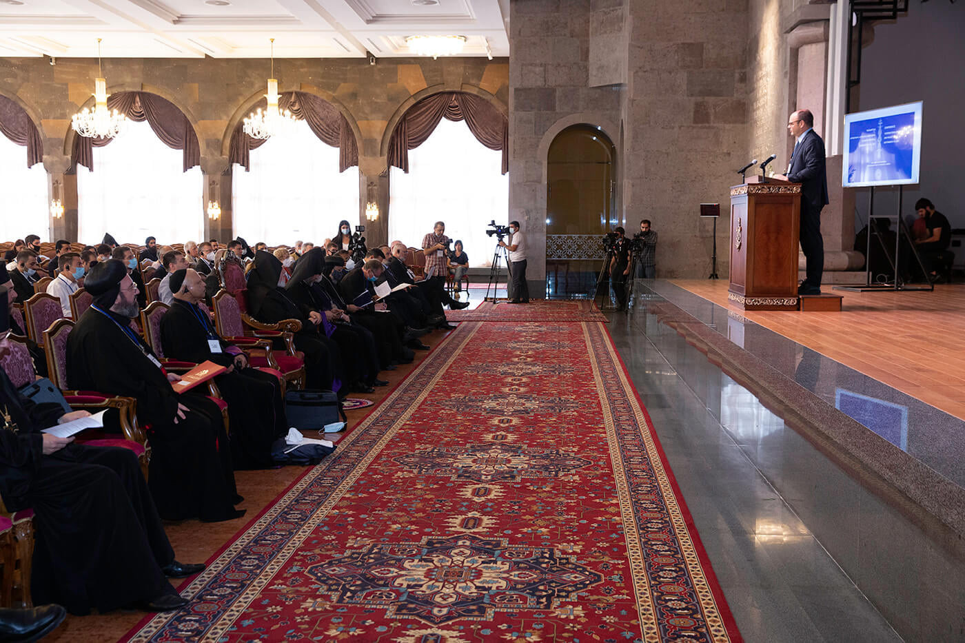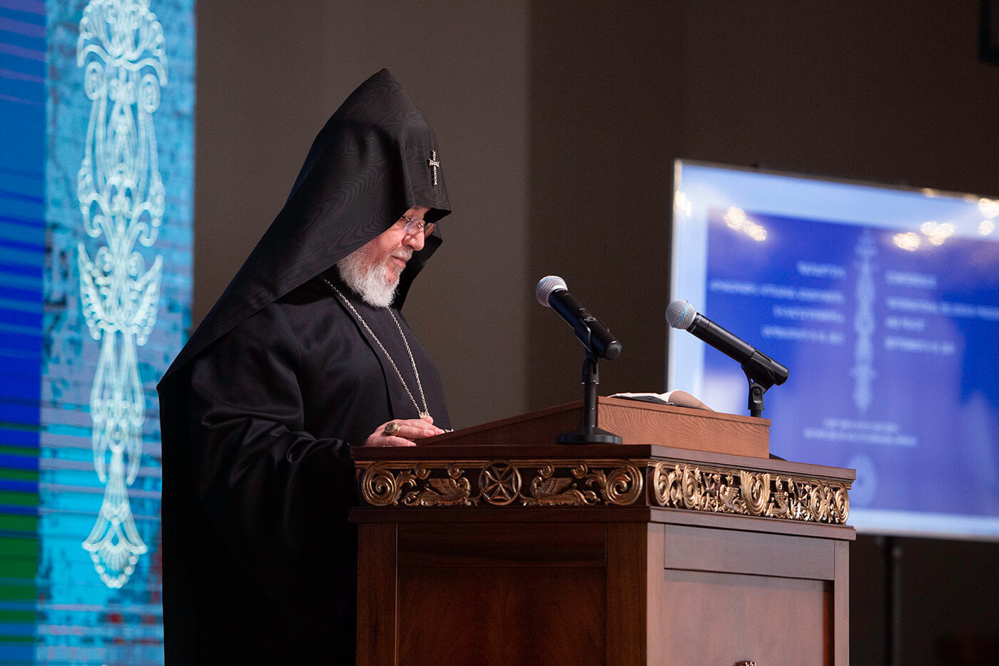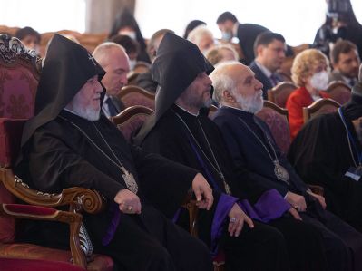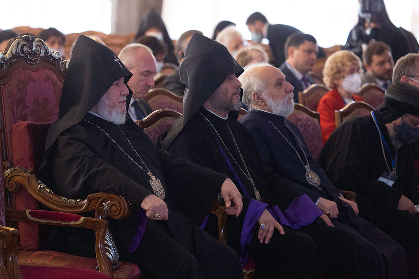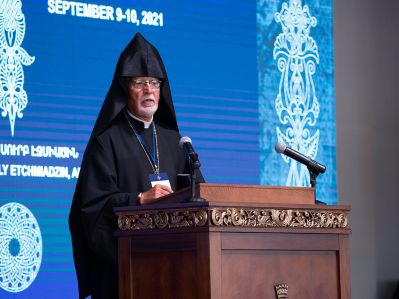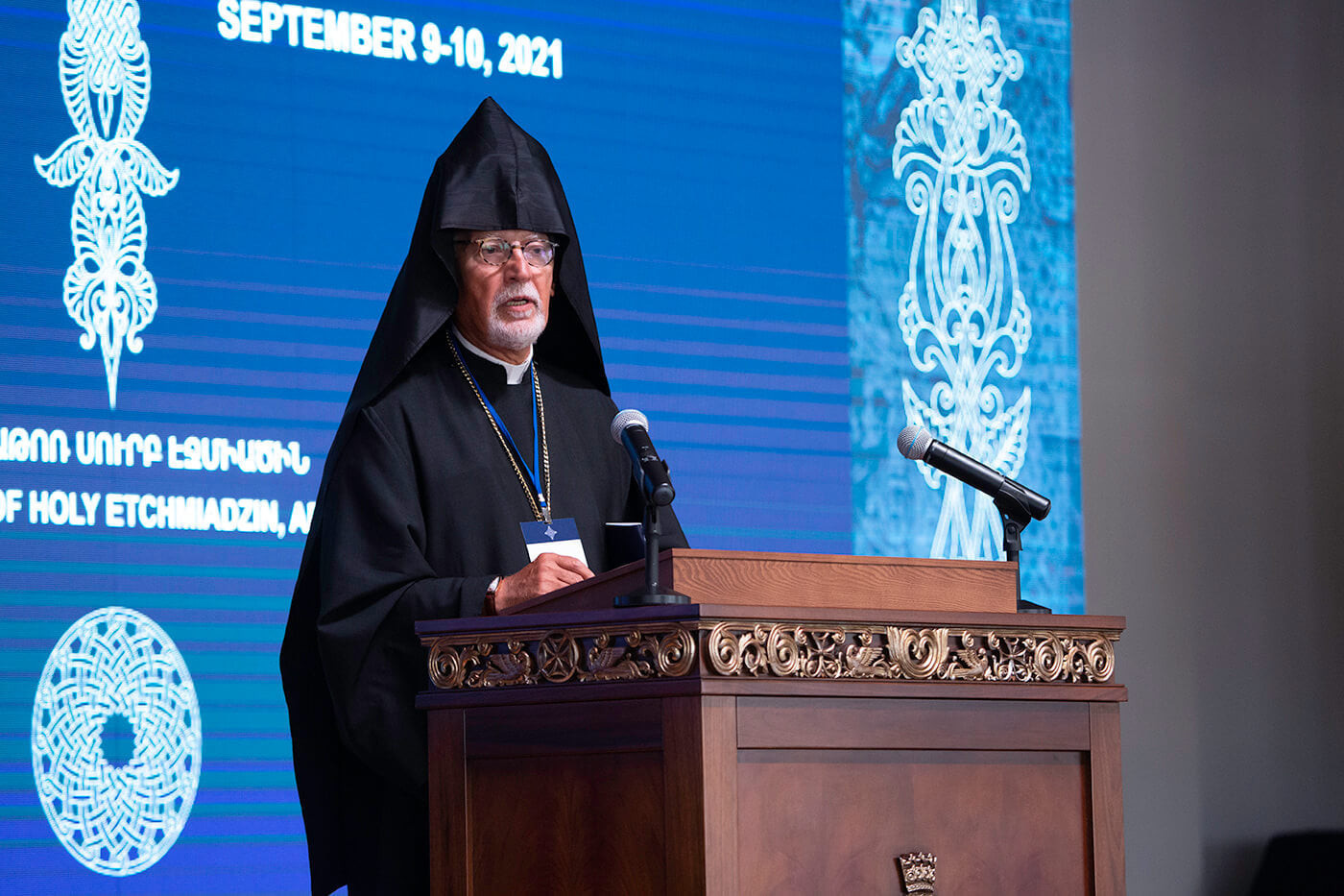 At the beginning of the conference, His Eminence Archbishop Vicken Aykazian, Chairman of the Committee of Artsakh Cultural-Spiritual Heritage, asked the attendees to hold a minute of silence in remembrance of the innocent victims of the 44-day War of Artsakh. Then, His Holiness Karekin II, Supreme Patriarch and Catholicos of All Armenians; conveyed His Message and Blessings to the participants of the Conference.
