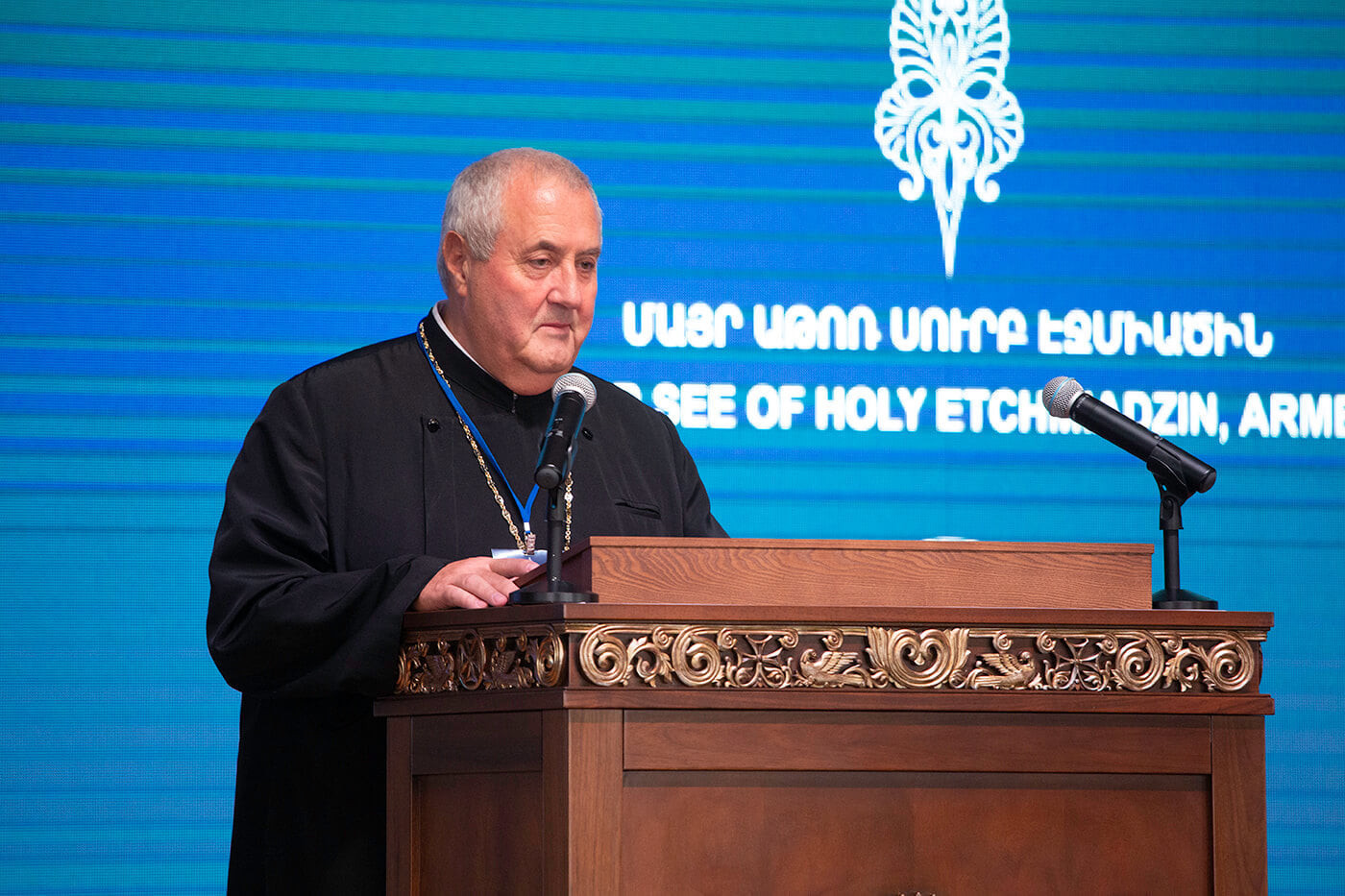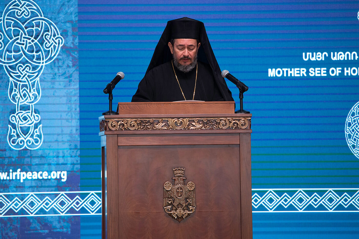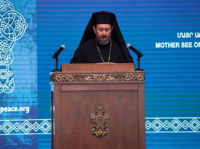 Esteemed members of the conference, we lift our prayers to God once again and bestow our blessing upon you here at the Mother see of Holy Etchmiadzin. We wish that the speeches and fruitful discussions presented by religious leaders, clergymen, leading scientists, and experts will contribute toward the establishment of freedom and peace in our world. We beseech the Lord so that the Holy Spirit may guide you and wish an efficient course to the conference”.