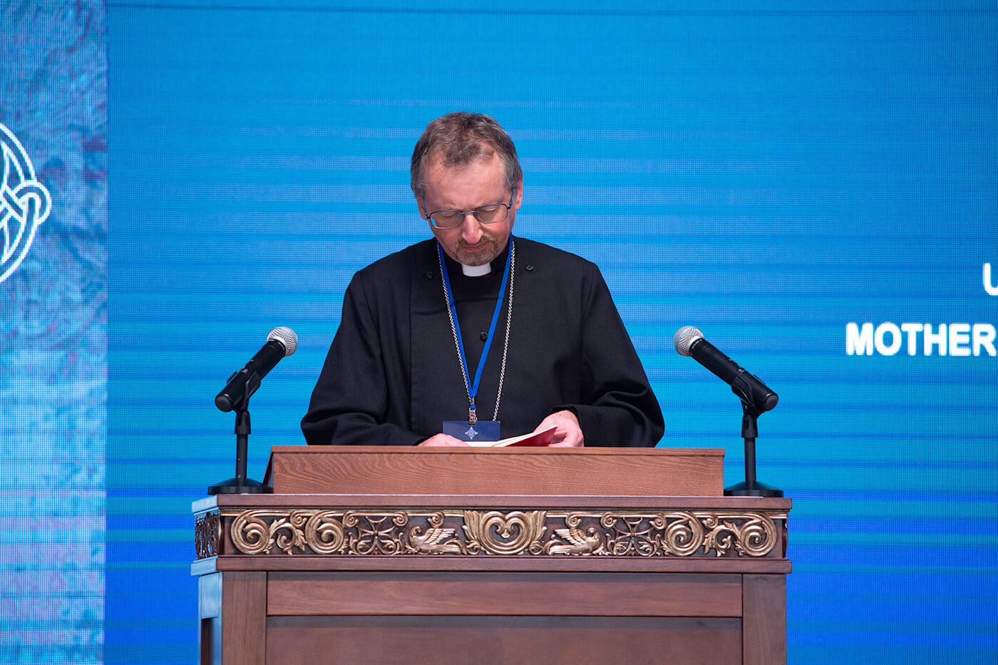 Fr. Ioan Sauca, Acting General Secretary of World Council of Churches; Rev. Fr. Christian Krieger, President of the Conference of European Churches; Mr. Jim Wrinkler, General Secretary and President of the National Council of Churches, USA; His Eminence Archbishop Angaelos, Primate of the Coptic Orthodox Diocese of London; His Eminence Archbishop Mor George Kourieh, Patriarchal Vicar in Belgium, France and Luxembourg of the Syriac Orthodox Church; the Right Rev. Robert Innes, Bishop of Gibraltar in Europe of the Churches of England; Fr. Abraham Thomas, Secretary to the Department of Ecumenical Relations of Malankara Orthodox Syrian Church of India; delivered their welcoming messages to those attendees; His Eminence Archbishop Jose Avelino Bettencourt, Apostolic Nuncio to Armenia; conveyed the message of Pope Francis of the Roman Catholic Church; Fr. Philaret Bulekov, Vice-Chairman of the Department of External Church Relations of the Patriarchate of Moscow of the Russian Orthodox Church, conveyed the message of Metropolitan Hilarion, Head of the same Department; Fr. Nikademus Yokhanaev, Priest of the Assyrian Community of Armenia, conveyed the message of His Holiness Mar Gewargis III, Catholicos–Patriarch of the Assyrian Church of the East.