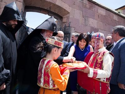 Students of the Nor Nork, Arabkir and Gymri Youth Centers greeted the guests with folk songs and dance performances in the courtyard of the monastery.