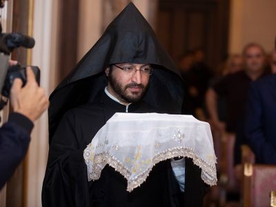 Then, under the singing of the "Etchmidzin I Hore", the Pontifical Encyclical and Medal were brought in, which was read by His Grace Bishop Moushegh Babayan, Director of Administration of the Mother See of Holy Etchmiadzin.