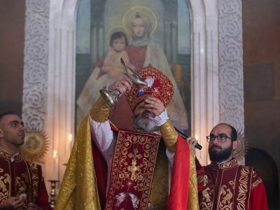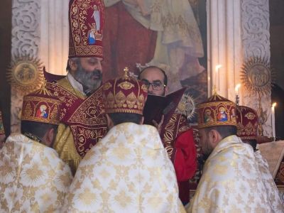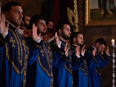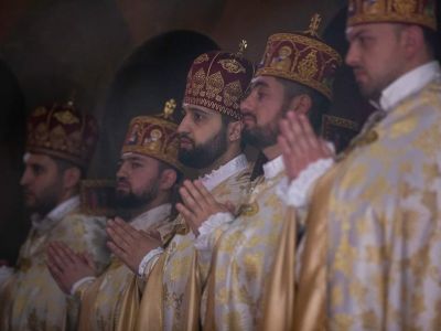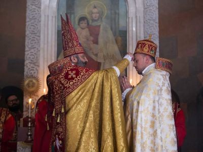 The Celebrant was His Grace Bishop Bagrat Galstanyan, Primate of the Diocese of Tavoush, who consecrated and ordained the five deacons, serving in various structures and dioceses of the Mother See, to the Holy Order of Priesthood. During the Divine Liturgy, His Grace Bishop Bagrat consecrated the foreheads and hands of the new priests with Holy Chrism (Muron) and gave them new names.