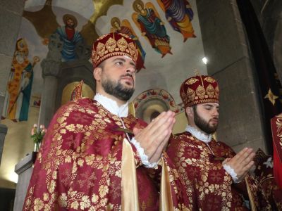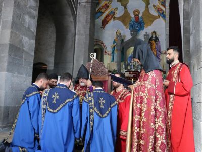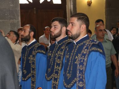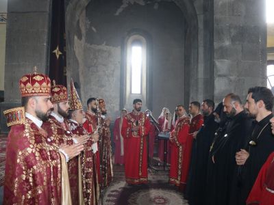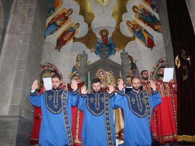 The Celebrants was His Grace Bishop Vahan Hovhannisyan, Director of the "Garegin A" educational center of the Mother See of Holy Etchmiadzin. His Grace Bishop Vahan ordained and annointed three deacons serving to different structures of the Mother See and Dioceses to the Holy Order of Priesthood. During the Divine Liturgy, His Grace Bishop Vahan consecrated the candidates foreheads and hands with Holy Chrism (Muron) and gave them new names.