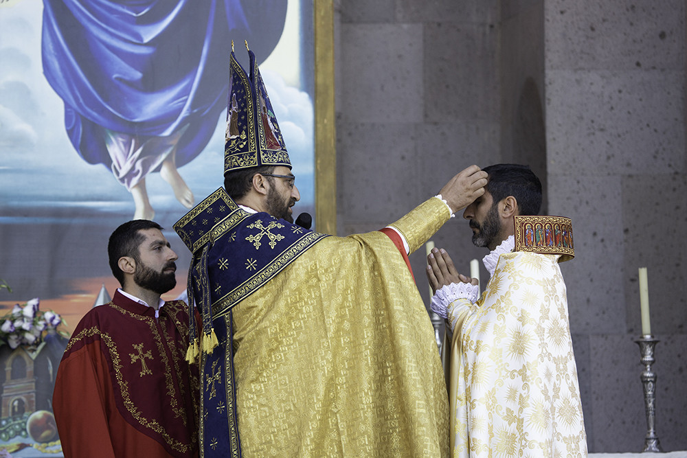 During the Ordination, Bishop Arshak consecrated the foreheads and hands of the new priests with Holy Chrism (Muron) and give them new names. Deacon Varazdat Qocharyan was renamed Fr. Hayk, Deacon Atom Gharagyozyan was renamed Fr. Hayasa, Deacon Vahan Sahakyan was renamed Fr. Haykazun and Deacon Narek Kirakosyan was renamed Fr. Armen.