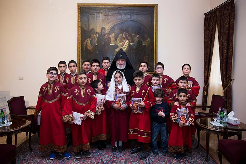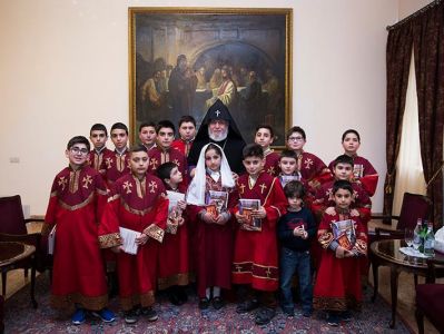 In the afternoon, the Catholicos of All Armenians received child scribes serving in different diocesan churches, who attended the Palm Sunday Divine Liturgy in the Mother Cathedral. Conveying his blessings to them, His Holiness praised the young people for their faithful character and wished to continue their church-devoted service with the same spirit.