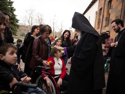 At the conclusion of the Divine Liturgy, the Catholicos of All Armenians once again blessed the children. In front of the Mother Cathedral, His Holiness conveyed his blessings to nearly 130 children with disabilities from the Hrazdan Children's Support Foundation Day Center, who arrived at the Mother See of Holy Etchmiadzin at the invitation of His Holiness.