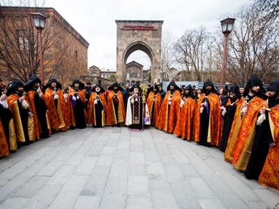A Divine Liturgy was offered in the Mother Cathedral. His Holiness and the procession of clergy were escorted to the Mother Cathedral by the students of the N1 primary school of Etchmiadzin.