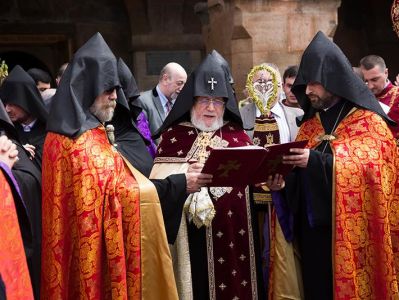 The Catholicos of All Armenians conveyed his blessings to all children gathered in the Mother See and granted crosses to the children and blessed branches were distributed to the faithful.