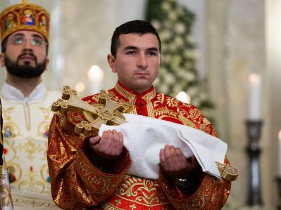 After the Blessing Service the Holy Cross was handed over to Mr. Gor Petrosyan, a junior sergeant from Shirak, who recently won the Medal of Courage; and this year served as the Godfather of the Cross during the ceremony in the St. Gregory the Illuminator Mother Cathedral.