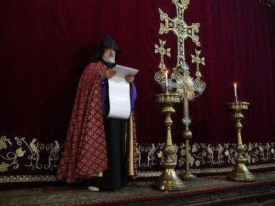 Under the singing of the “Etchmiadzin I Hore” hymn, His Eminence Archbishop Vasken Mirzakhanyan, Director of the Office of Social Doctrine of the Mother See, placed the Pontifical Encyclical at the Holy Altar of Descent, which was read by His Grace Bishop Artak Tigranyan, Dean of the Monasteries of the Mother See.