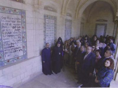 Following the Pontifical Divine Liturgy, the pilgrims toured the city to get acquainted with historical Jerusalem. From the St. James Mother Cathedral the procession led by the Supreme Patriarch went to the Holy Resurrection Cathedral. Here the pilgrims knelt before the place where the body of Jesus was wrapped with linen and where Joseph of Arimathea anointed the body of Jesus, after it had been taken off the cross. In memory of this anointing, the site is continuously sprinkled with rose oil. This same rite was also conducted by the Armenian pilgrims. From there, they went to the Lord's tomb where, following the ceremony held under the presidency of the Supreme Patriarch, they knelt and kissed the empty tomb. The pilgrims also visited the Passion Site under the Holy Resurrection Cathedral, the Chapel-Altars of Sacred Garden, Patriarch Lukianus, Distribution of Raiments (garments), Discovery of the Cross, Illuminator, Crown of Thorns, Josef of Arimathaea, and of Holy Mother of God's fainting as well as Holy Golgotha; they lived moments of pride for the significant Armenian presence in these Christian Shrines.