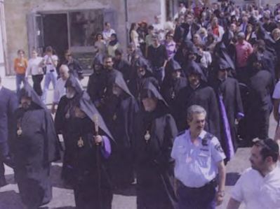 The first stop of the Pontifical Pilgrimage was Jerusalem. On May 12, a procession with the pilgrims and Armenians of Jerusalem traveled to the Armenian Patriarchate of Jerusalem. Led by the Supreme Patriarch and under the singing of "Hrashapar" they entered the St. James Mother Cathedral. At the end of the ceremony a reception was held in the Patriarchal headquarters, during which His Beatitude Archbishop Torgom Manoukian Armenian Patriarch of Jerusalem delivered his welcoming message after which the Catholicos of All Armenians expressed his appreciation.