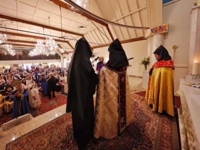 Following the Salt and Bread service, under the singing of the hymns, His Holiness Karekin II solemnly entered the Church where more than 400 faithful were waiting for the blessed visit of the Armenian Pontiff. Blessing the pious Armenians, His Holiness ascended to the Holy Altar, where the Church Worship Service was held.