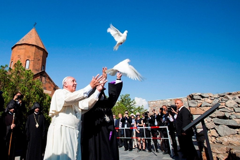 Following the brief service, the Patriarchs moved to an outdoor platform overlooking the biblical Mount Ararat, where as a sign of peace, two doves were released towards the closed Armenian-Turkish border.