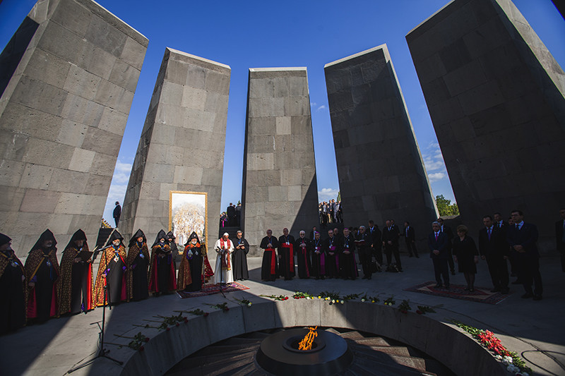 Under the presidency of His Holiness and Pope Francis, an Intercessional Rite of the Holy Martyrs of the Armenian Genocide was offered in front of the eternal flame. The choir of Holy Etchmiadzin sang the hymn "Hrashatsan pakutsmamb", which is dedicated to the Saintly Martyrs of the Armenian Genocide. Bible passages, psalms and remarks were read by the clergy of the two Churches.