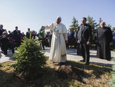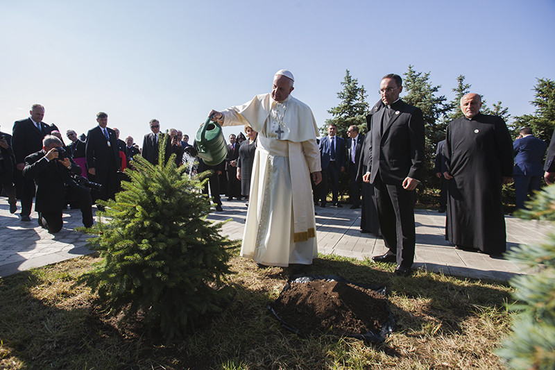 At the conclusion of the ceremony, the RA President and two Pontiffs visited the Memorial Park in memories of the Genocide victims in Armenia, where the Pope blessed an evergreen tree planted in his name.