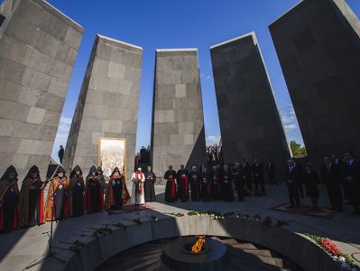 A solemn procession of clergy, led by honour guards, walked to the Armenian Genocide Martyrs Monument. Children with icons of the Armenian Genocide victims were standing on the path to the Memorial Complex. Following a wreath placing in memory of the martyrs, the national anthem of the Vatican was performed.