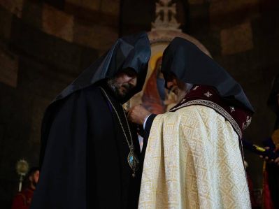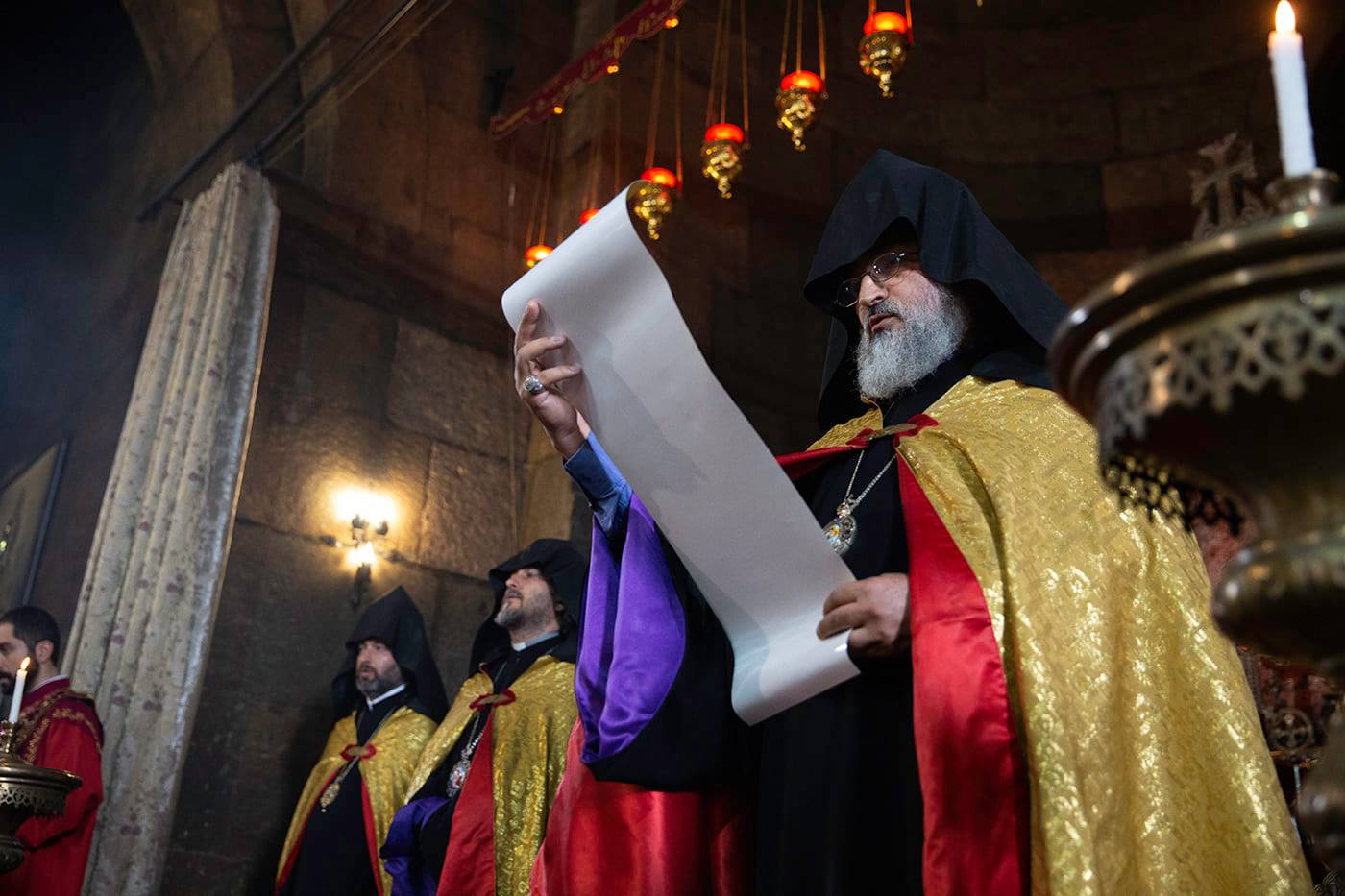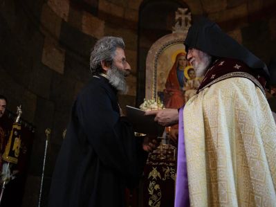 His Grace Bishop Moushegh Babayan, Grand Sacristan of the Mother See, offered welcoming remarks. Following the Prayer for the Republic, under the singing of the hymn “Etchmiadzin i Hore”; His Grace Bishop Vasken Mirzakhanian, Director of the Office of Social Doctrine of the Mother See, brought the Pontifical Encyclicals to the Altar, from which, His Grace Bishop Artak Tigranian, Dean of the Monasteries of the Armenian Church, read the awarding Encyclical of His Eminence Archbishop Pargev Martirosyan, Pontifilal envoy-at large.