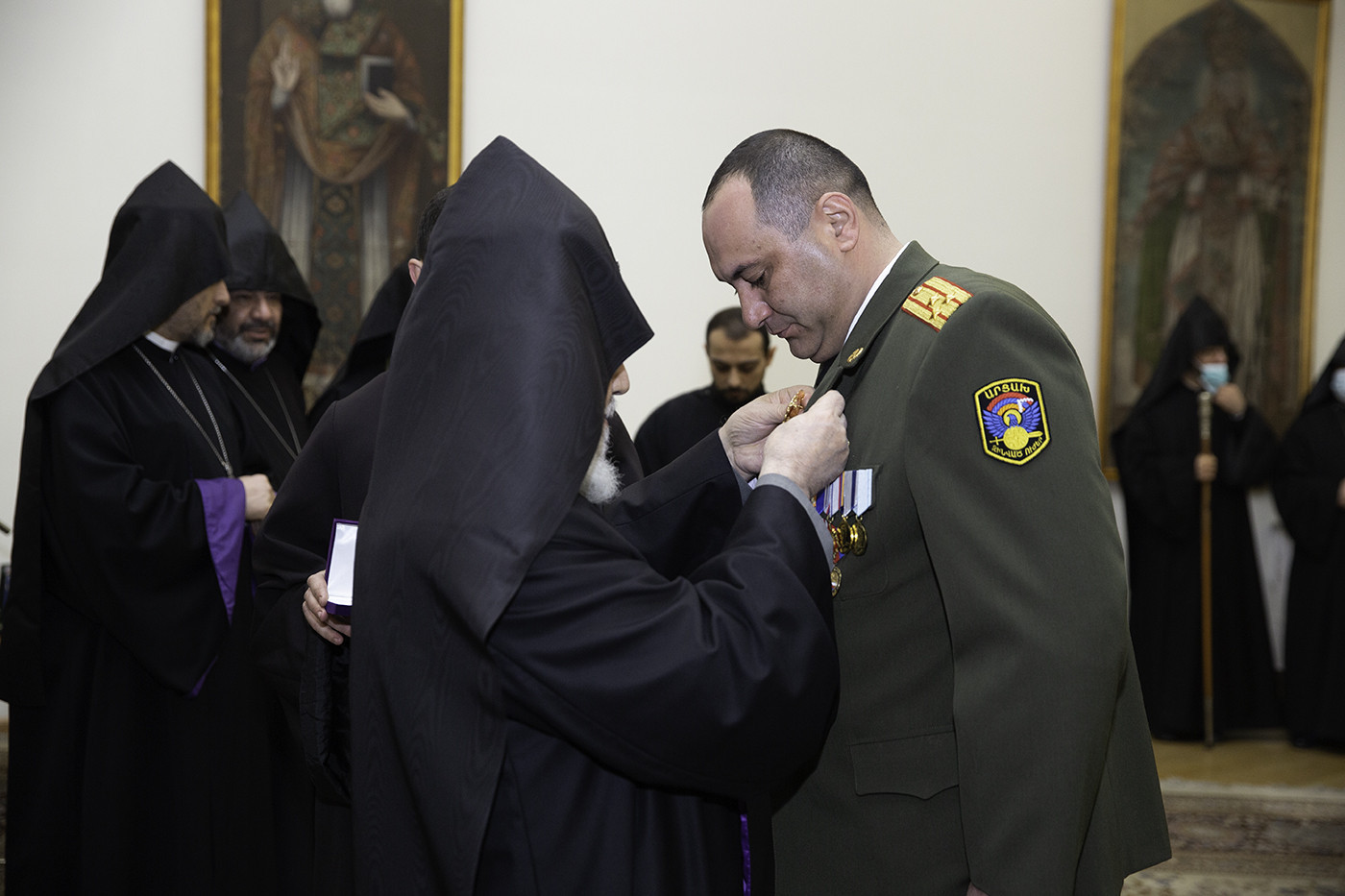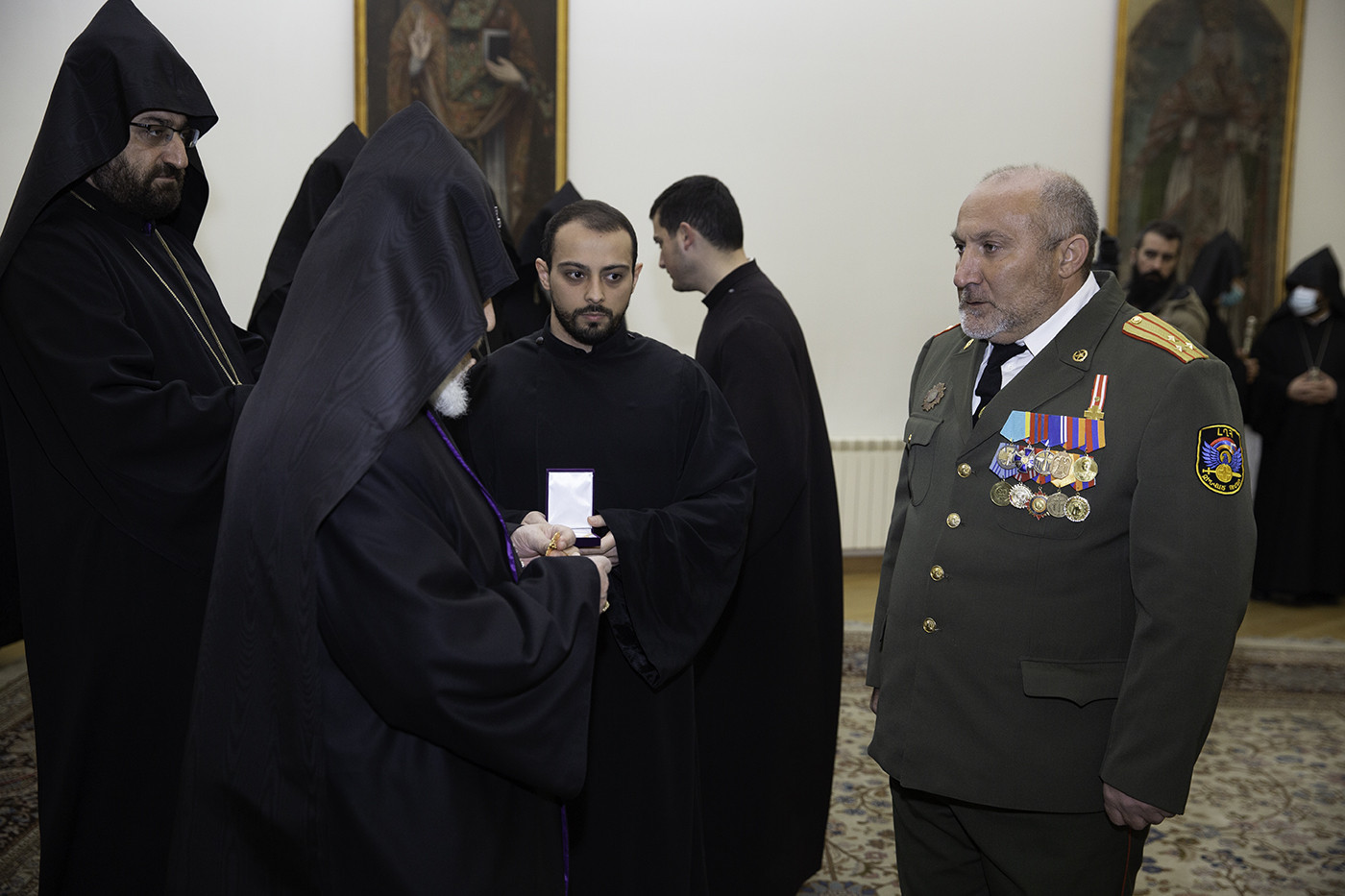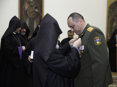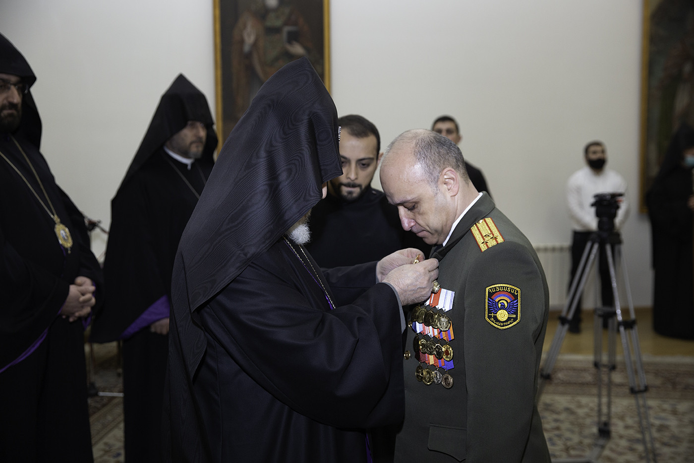 In appreciation of the service brought to the Fatherland, upon the request of the Armed Forces Chaplaincy, His Holiness awarded the “St. Nerses the Graceful” order of the Armenian Church to the servicemen of the RA Ministry of Defense and Defense Army of the Republic of Artsakh: Colonels Karen Javalyan, Artur Poghosyan, Norayr Mkrtchyan, Gagik Aslanyan, Aren Sargsyan and Erik Grigoryan. His Holiness also awarded the "St. Nerses the Graceful" order to the RA Deputy Minister of Defense Arman Sargsyan and the Deputy Secretary General of the RA Ministry of Defense Tigran Gharibyan.