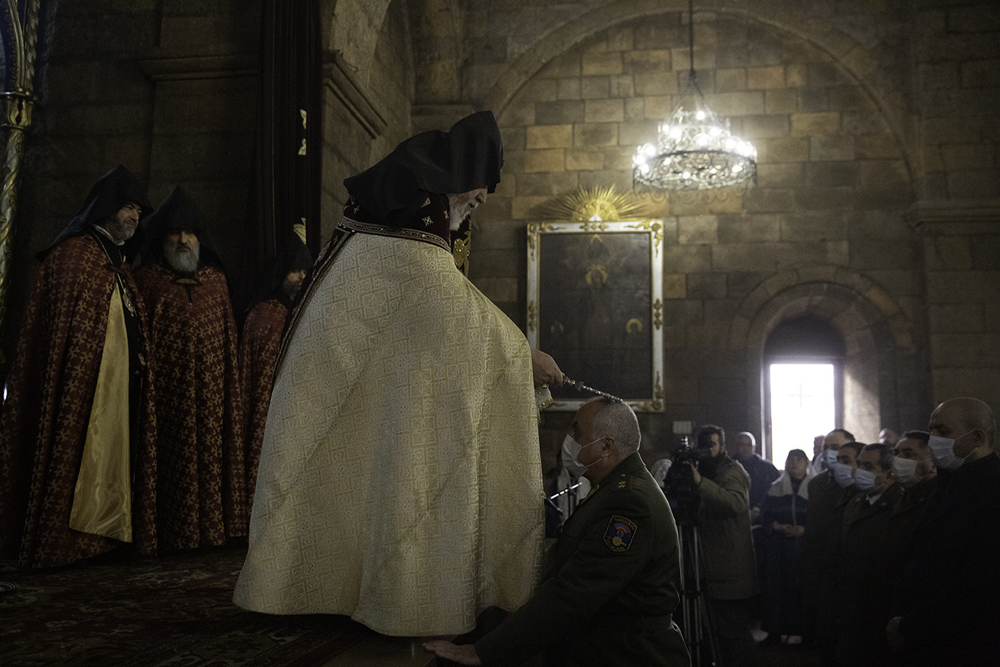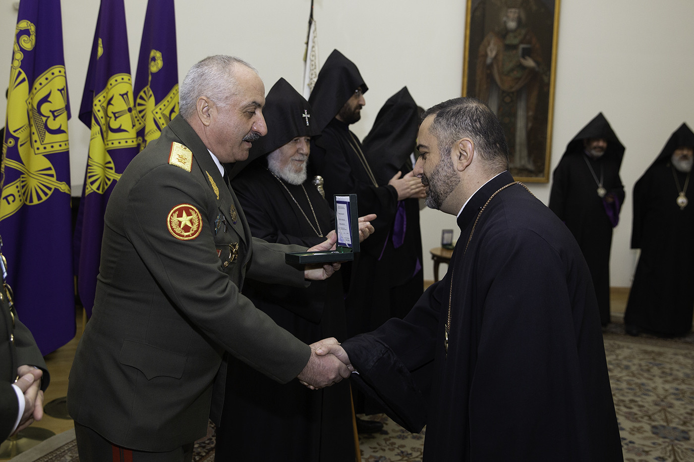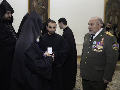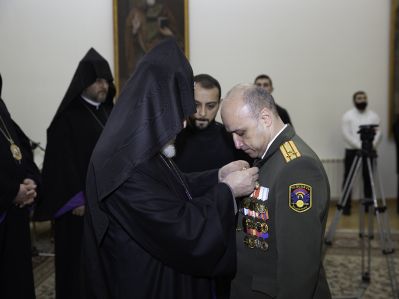In appreciation of the service brought to the Fatherland, upon the request of the Armed Forces Chaplaincy, His Holiness awarded the “St. Nerses the Graceful” order of the Armenian Church to the servicemen of the RA Ministry of Defense and Defense Army of the Republic of Artsakh: Colonels Karen Javalyan, Artur Poghosyan, Norayr Mkrtchyan, Gagik Aslanyan, Aren Sargsyan and Erik Grigoryan. His Holiness also awarded the "St. Nerses the Graceful" order to the RA Deputy Minister of Defense Arman Sargsyan and the Deputy Secretary General of the RA Ministry of Defense Tigran Gharibyan.
