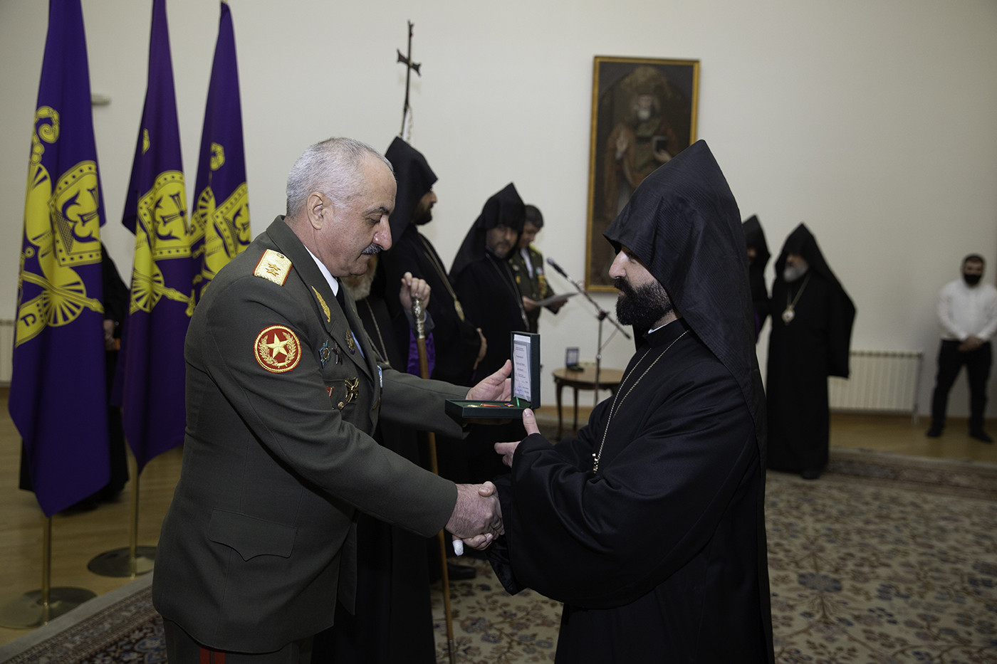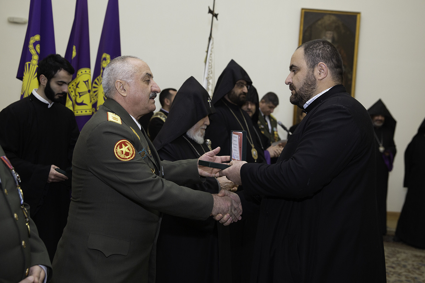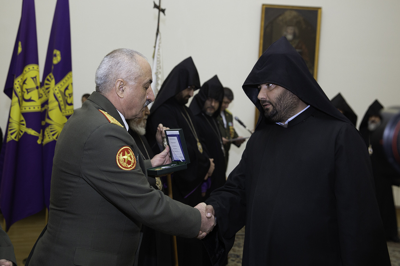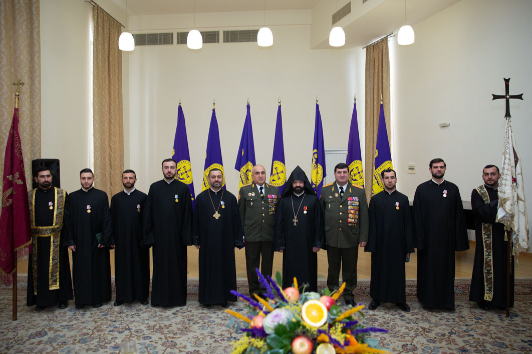 Rev. Fr. Archimandrite Ruben Zargarian, Chaplain of the Prison Ministries; Rev. Fr. Aris Tonoyan, Abbot of the St. Shoghakat Monastery; Rev. Fr. Psak Mkrtchyan, Senior Chaplain of the RA Defense Ministry; Chaplains Rev. Fr. Manuk Zeynalyan and Rev. Fr. Trdat Gevorgyan, were granted with the order of “Andranik Ozanyan”. Chaplains Deacon Gagik Hakobyan, Deacon Minas Karapetyan, Deacon Loris Andreasyan, Deacon Simon Igityan, Deacon Gevorg Mirzoyan, Deacon Artur Ohanyan and Deacon Artur Aramyan were granted with the Medal of “Drastamat Kanayan”.