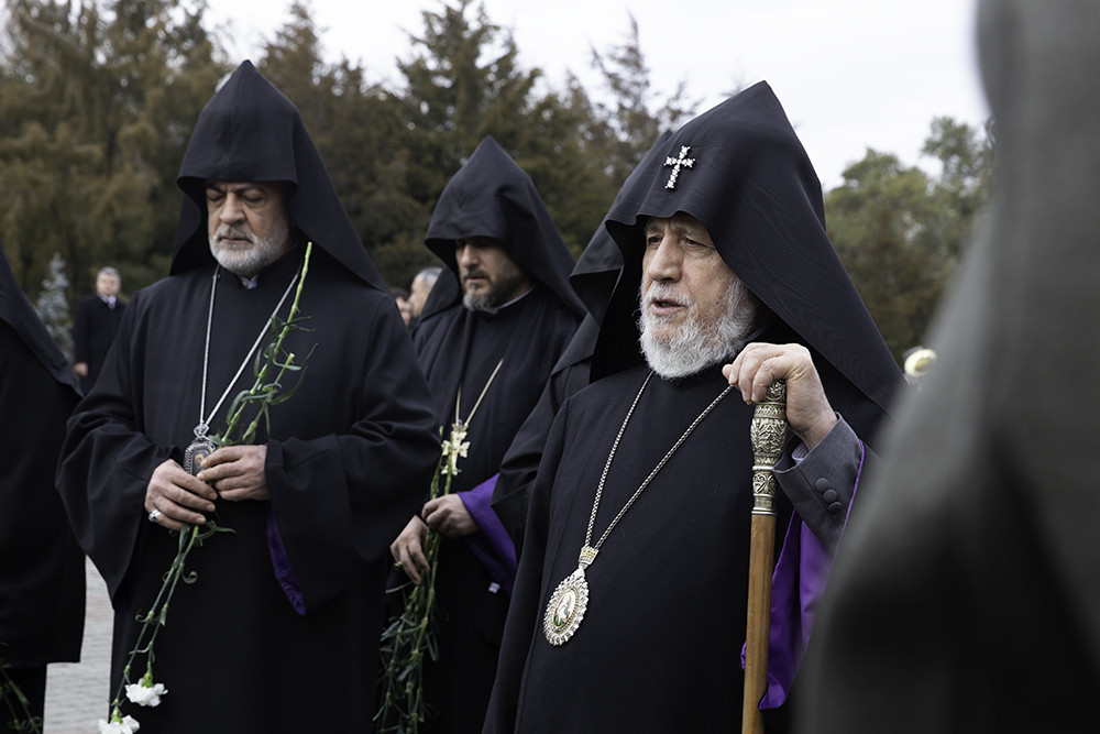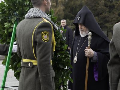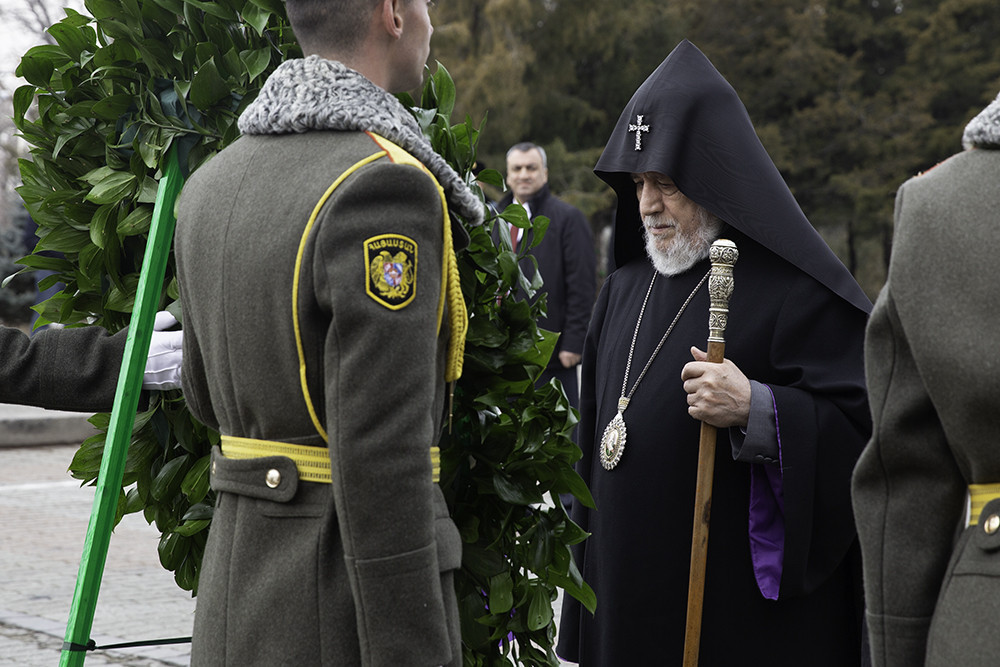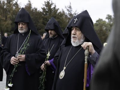 Following the placement of the wreaths, the Pontiff of All Armenians; along with His Eminence Archbishop Navasard Kjoyan, Vicar of the Araratian Patriarchal Diocese; His Eminence Archbishop Nathan Hovhannisyan, Director of the External Relations and Protocol Department of the Mother See; His Grace Bishop Vrtanes Abrahamyan, Head Chaplain of the Armed Forces of the Republic of Armenia; and His Grace Bishop Moushegh Babayan, Director of the Operations of the Mother See; prayed for the peace of souls of the victims of the Sumgait massacres, then laid flowers at the cross-stone memorials erected in honor of the victims.