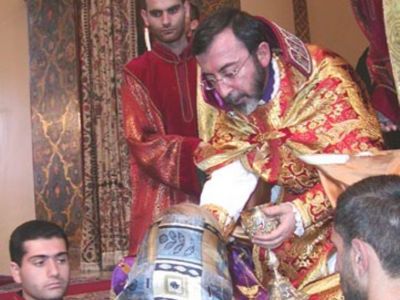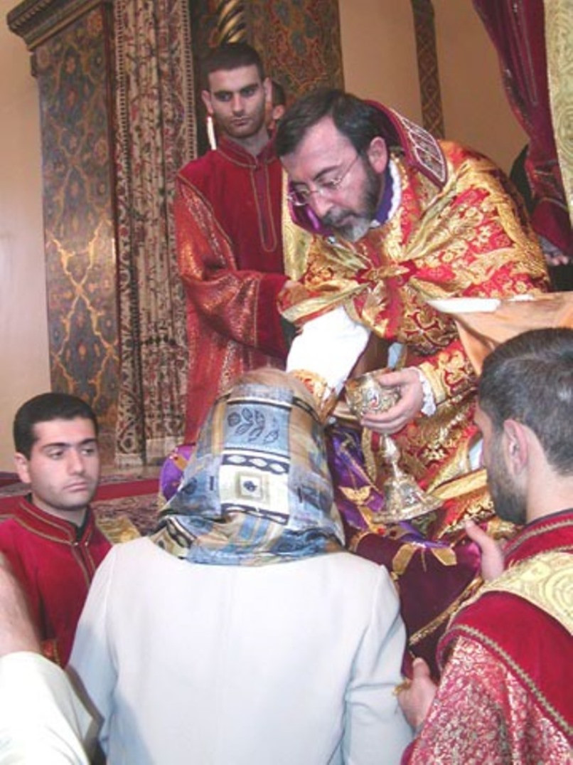 "Today we have come on a pilgrimage from the United States, to renew ourselves through this Holy and Immortal Liturgy, to kiss the anointed Right Hand of His Holiness, and to return to America renewed by the sacred mystery of Holy Etchmiadzin in order to continue our life as faithful sons of the Armenian Church, and faithful soldiers of this Most Holy See of the Catholicosate of All Armenians. . . . . Looking towards the future, we should also remember the past. All Armenians, gathering around St. Gregory the Illuminator, created spiritual unity and the built this Holy Cathedral of Etchmiadzin. Today, on the occasion of the 1,700th Anniversary of the consecration of the Mother Cathedral, we have the need for that spiritual unity. If we aspire for our homeland to grow stronger, if we desire that love, kindness, and a knowledge of conscience be spread throughout every Armenian family, and in every Armenian life, we must create that spiritual unity. Life cannot continue without the presence of God. Without the presence of God, our homeland cannot progress. We must love and respect one another, and as 1,700 years ago, we must gather around our Pontiff, and we shall continue in the building of our tradition."