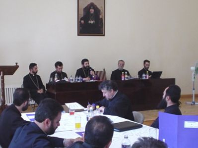 The three-day retreat for the Brotherhood of Holy Etchmiadzin continued in the Mother See on Friday, June 25. Friday morning began with Morning Services in the Mother Cathedral. The first presentation of the day was by Very Rev. Fr. Zareh Dz. Vardapet Baronian, from Rumania. His topic was: "How can we implement the Edification of the 'Body of Christ' both in ourselves as well as our faithful flock?" In the afternoon, His Grace Bishop Vazgen Mirzakhanian, Primate of the Diocese of Georgia, presented his lecture entitled: "The brave pastor in the Gospel of John and the similarities and differences with the present-day pastor-monk". The participants had lively discussions on the topics presented.