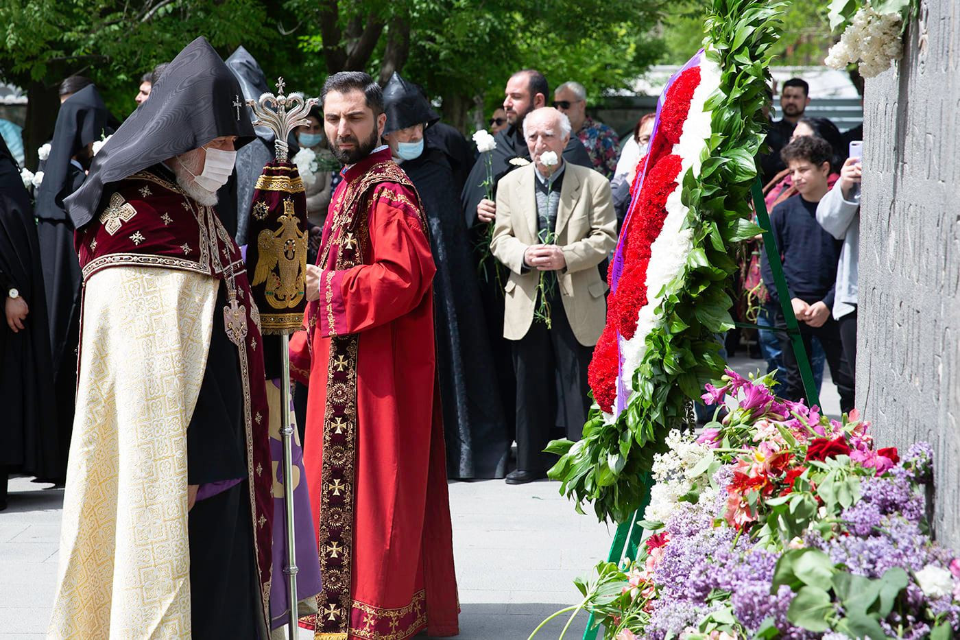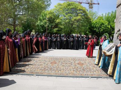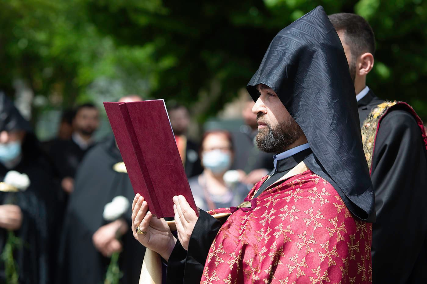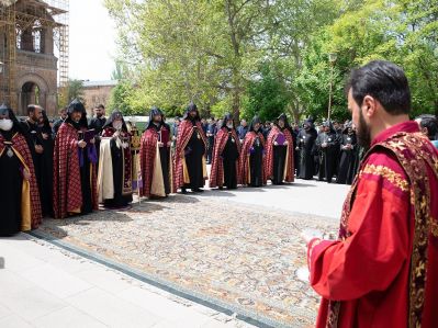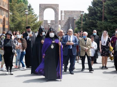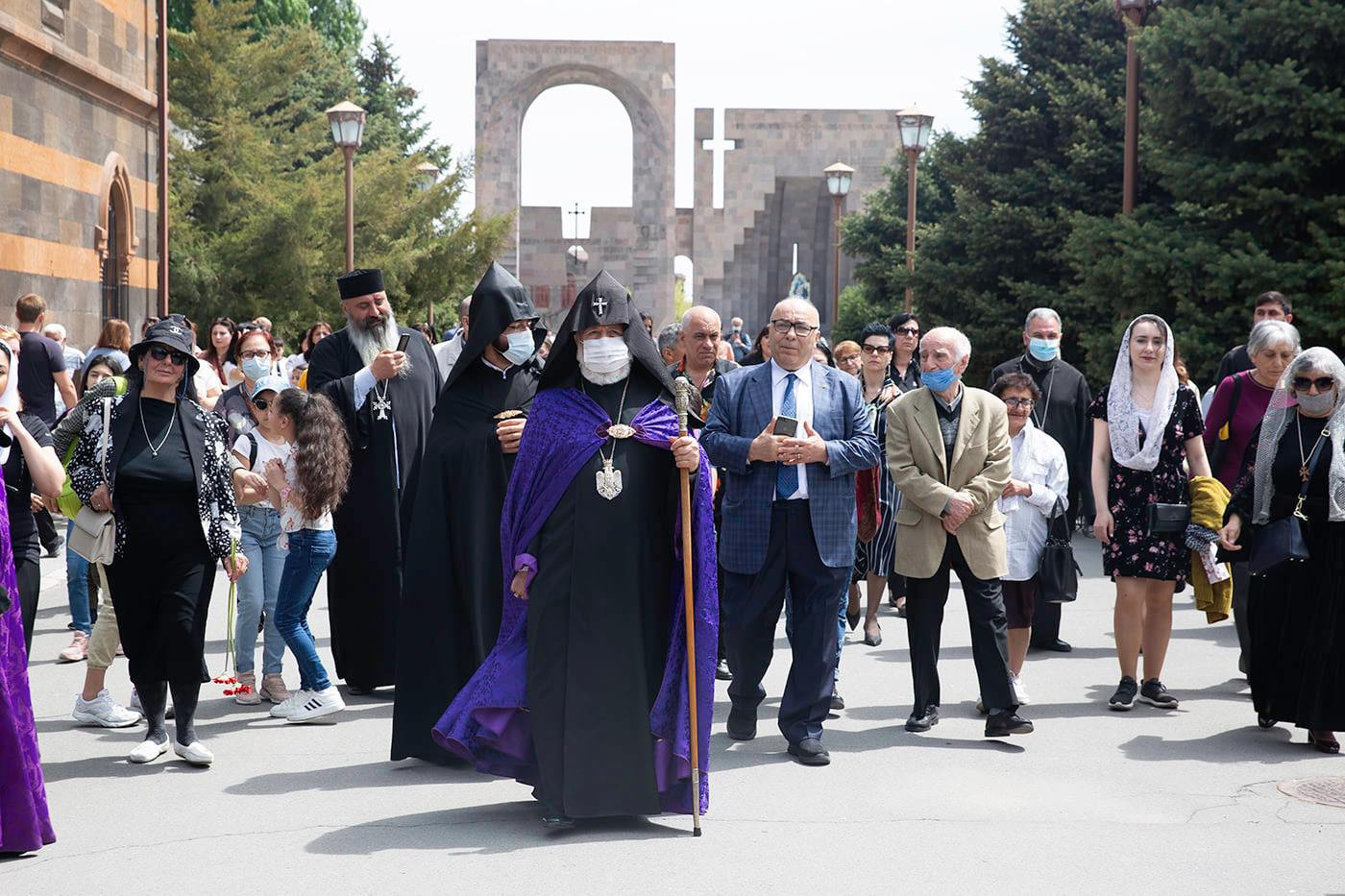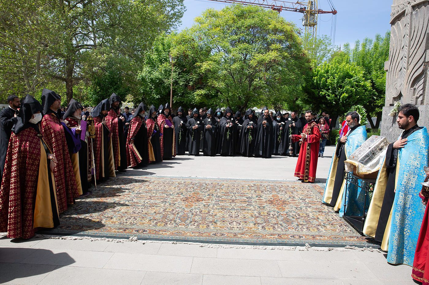 On April 24, Commemoration Day of the Armenian Genocide and the Holy Martyrs, the Brotherhood of Holy Etchmiadzin lead by His Holiness Karekin II, Supreme Patriarch and Catholicos of All Armenians; participated in the Divine Liturgy at St. Gayane Monastery. On this day, the relics of the holy martyrs of the Armenian Genocide were taken out for the faithful. The celebrant was His Eminence Archbishop Pargev Martirosyan, Pontifical Legate with Special Commitments. During the Divine Liturgy, the message of His Holiness Karekin II Supreme Patriarch and Catholicos of All Armenians on the occasion of the commemoration of the Martyrs of the Armenian Genocide; was read. “More than a century has passed since the Armenian Genocide was planned and committed by Ottoman Turkey. Our people suffered genocide and were scattered all over the world in their surviving remnants, leaving one and a half million martyrs in their historical homeland and in the deserts of deportation. At the beginning of the 20th century, the genocide of the Armenian people was defined as the first crime against humanity of the century, with the monstrous manifestations of national annihilation and ethnic enmity. Today, the pain of the tragedy of the Genocide has overwhelmed the souls of our people, burdened with the heavy losses of the Artsakh war, in a new way. Before the blessed memory of our holy martyrs, it is our cherished duty to strengthen national unity, to refrain from violence and conflicts in domestic political developments, and to pursue the protection of our rights with a zealous spirit. The only guarantee of enriching the life of our people with achievements, and withstanding the challenges and threats we face, is a high sense of responsibility for strengthening the state, and the consolidation of national and spiritual values. With the intercession of our Holy Martyrs, we pray to the Most Merciful Lord that our country will be peaceful and secure, that our people all over the world will unite and build a prosperous and bright future for the sake of the nation and the Homeland”- it was stated in the Pontifical Message. Following the Divine Liturgy, the procession of clergymen carrying the relics of the holy martyrs headed to the courtyard of the Mother Cathedral, where His Holiness Karekin II, Supreme Patriarch and Catholicos of All Armenians offered an intercession service at the Memorial to the Genocide and Khachkar of Prayer and Oath.