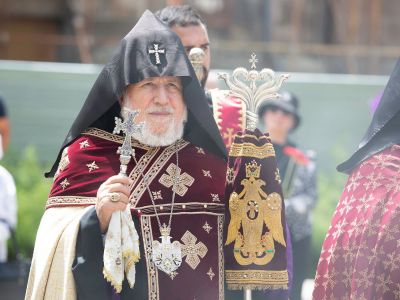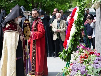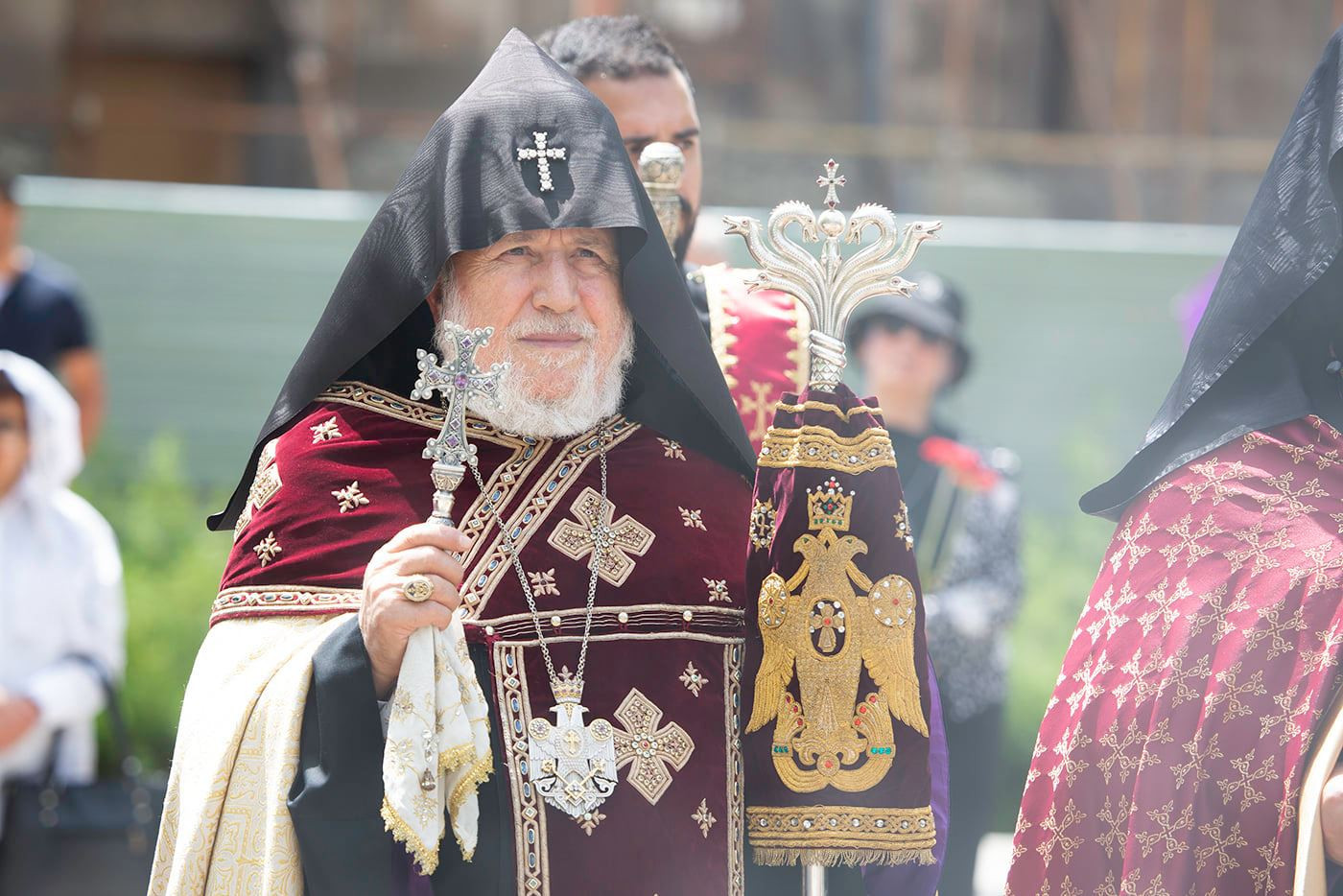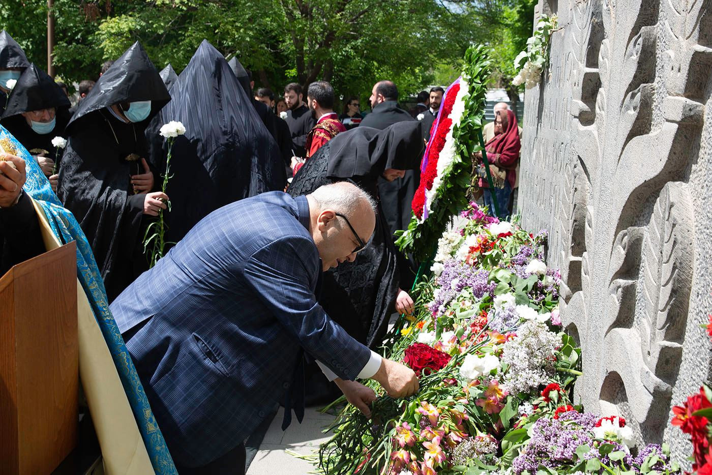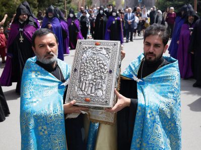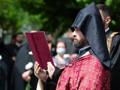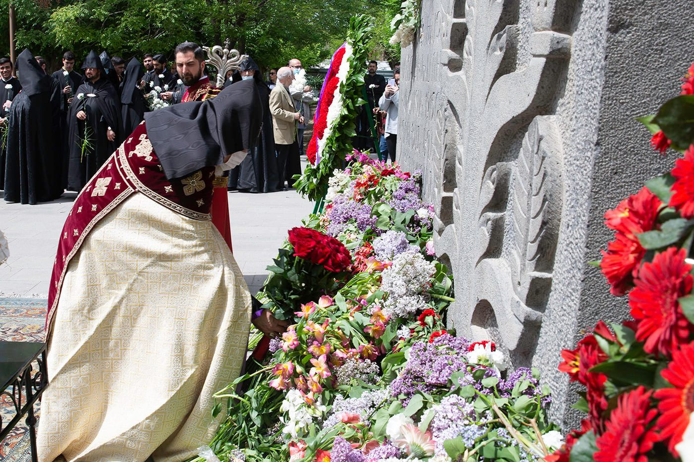 On April 24, Commemoration Day of the Armenian Genocide and the Holy Martyrs, the Brotherhood of Holy Etchmiadzin lead by His Holiness Karekin II, Supreme Patriarch and Catholicos of All Armenians; participated in the Divine Liturgy at St. Gayane Monastery. On this day, the relics of the holy martyrs of the Armenian Genocide were taken out for the faithful. The celebrant was His Eminence Archbishop Pargev Martirosyan, Pontifical Legate with Special Commitments. During the Divine Liturgy, the message of His Holiness Karekin II Supreme Patriarch and Catholicos of All Armenians on the occasion of the commemoration of the Martyrs of the Armenian Genocide; was read. “More than a century has passed since the Armenian Genocide was planned and committed by Ottoman Turkey. Our people suffered genocide and were scattered all over the world in their surviving remnants, leaving one and a half million martyrs in their historical homeland and in the deserts of deportation. At the beginning of the 20th century, the genocide of the Armenian people was defined as the first crime against humanity of the century, with the monstrous manifestations of national annihilation and ethnic enmity. Today, the pain of the tragedy of the Genocide has overwhelmed the souls of our people, burdened with the heavy losses of the Artsakh war, in a new way. Before the blessed memory of our holy martyrs, it is our cherished duty to strengthen national unity, to refrain from violence and conflicts in domestic political developments, and to pursue the protection of our rights with a zealous spirit. The only guarantee of enriching the life of our people with achievements, and withstanding the challenges and threats we face, is a high sense of responsibility for strengthening the state, and the consolidation of national and spiritual values. With the intercession of our Holy Martyrs, we pray to the Most Merciful Lord that our country will be peaceful and secure, that our people all over the world will unite and build a prosperous and bright future for the sake of the nation and the Homeland”- it was stated in the Pontifical Message. Following the Divine Liturgy, the procession of clergymen carrying the relics of the holy martyrs headed to the courtyard of the Mother Cathedral, where His Holiness Karekin II, Supreme Patriarch and Catholicos of All Armenians offered an intercession service at the Memorial to the Genocide and Khachkar of Prayer and Oath.