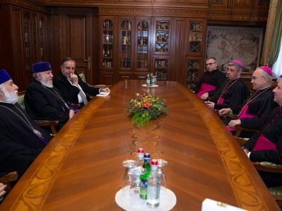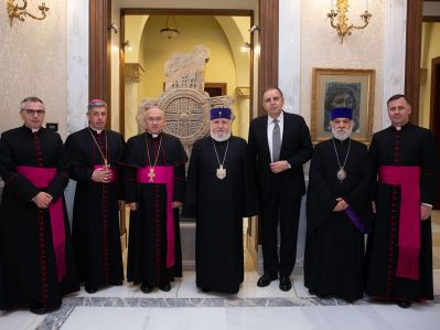 Welcoming the visit of the representatives of the Sister Churches to the Armenian Spiritual Center, His Holiness expressed hope that the opening of the Diplomatic Representation of the Holy See in Yerevan will provide new opportunities for cooperation between the Vatican and the Mother See. The Armenian Pontiff affirmed that warm and fraternal relations have been established between the Mother See and the Vatican, as evidenced by the visits of His Holiness Pope John Paul II and Pope Francis to Armenia and the Mother See of Holy Etchmiadzin; as well as the event organized on the occasion of the 100th anniversary of the Armenian Genocide in the Holy See, and the proclamation of St. Gregory of Narek as an Ecumenical Archimandrite. His Holiness stressed that the Representation of the Mother See in the Vatican contributes to the further strengthening and deepening of the friendly ties between the two Churches.