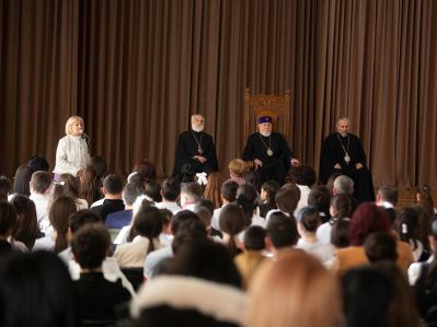 The meeting began with the welcome remarks by Ms. Lianna Arakelyan, the acting director of Youth Centers. The latter presented to His Holiness the recorded successes of the Youth Centers, particularly referring to the achievements of the students in various fields. In her speech, Ms. Arakelyan thanked the Catholicos of All Armenians for the paternal care and concern shown to the Youth Centers and emphasized that those educational centers, overcoming various difficulties, continue to carry out their mission in the country's life with honor.