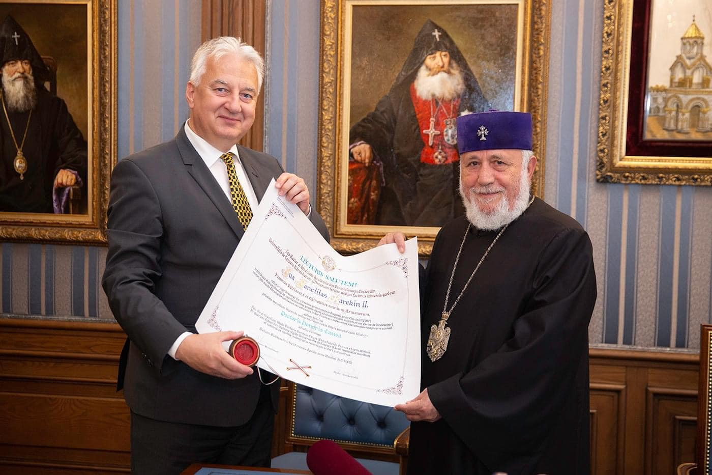 Mr. Zsolt Semjen also performed another duty, presenting the Patriarch of All Armenians with an honorary doctorate from Károli Gáspár University in Budapest.