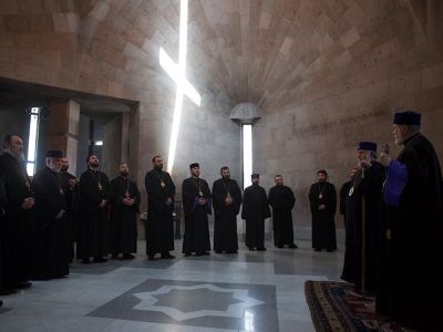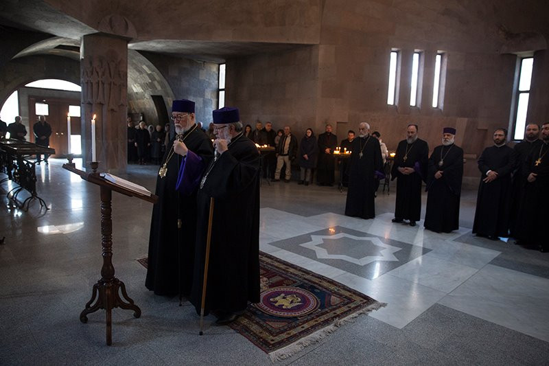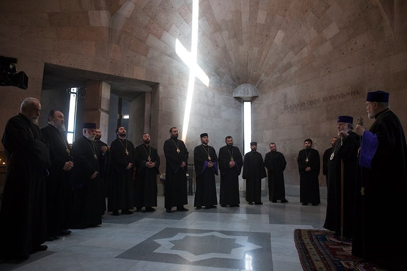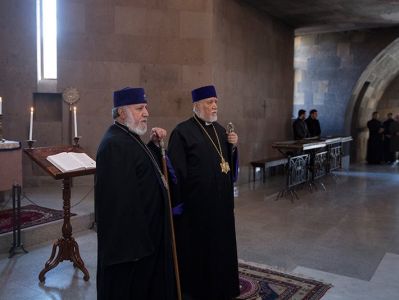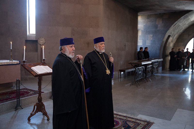 Following the fraternal welcome in front of the St. Trdat arch, the Catholicos of All Armenians and Catholicos of the Great House of Cilicia, under the ringing of the Mother Cathedral bells and accompanied by the Brotherhood of the Mother See, were led to the St. Vartan and St. Hovhannes Chapel-Baptistry, where they offered a joint prayer.