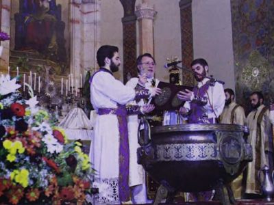On this day, the Armenian Church also offers a special Blessing of the Waters Service to celebrate the Baptism of Christ, which was the commencement of His earthly ministry. Before the Main Altar of the Cathedral, the Catholicos of All Armenians offered the service, wherein he blessed the waters with the cross and the Holy Chrism, in commemoration of Christ blessing the waters with his baptism and presence in the River Jordan. The Godfather of the Cross for the service was Mr. Vardan Oskanian, Foreign Minister of the Republic of Armenia.