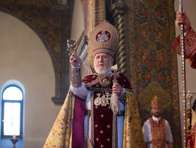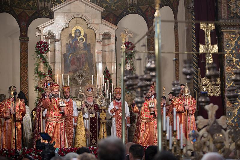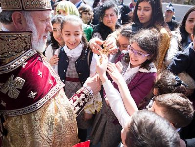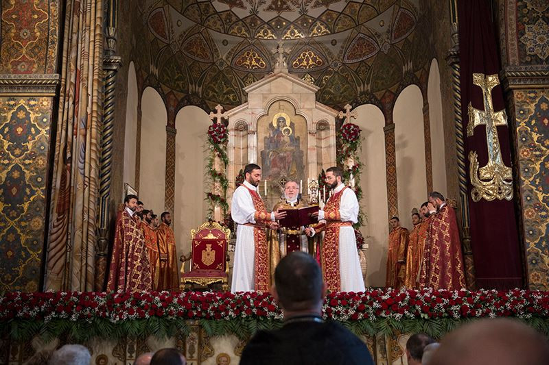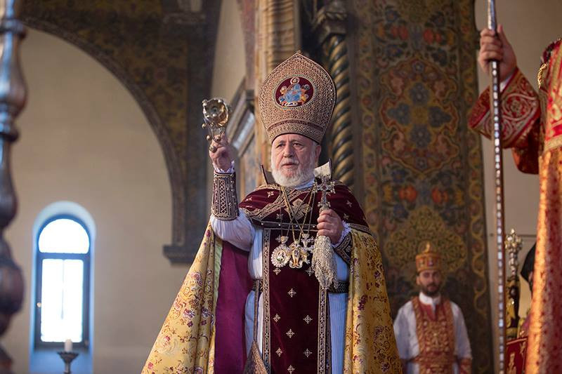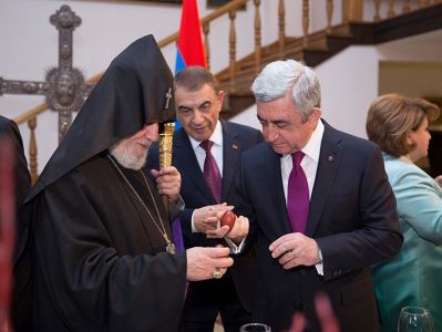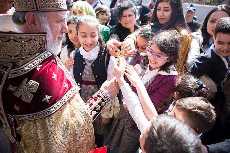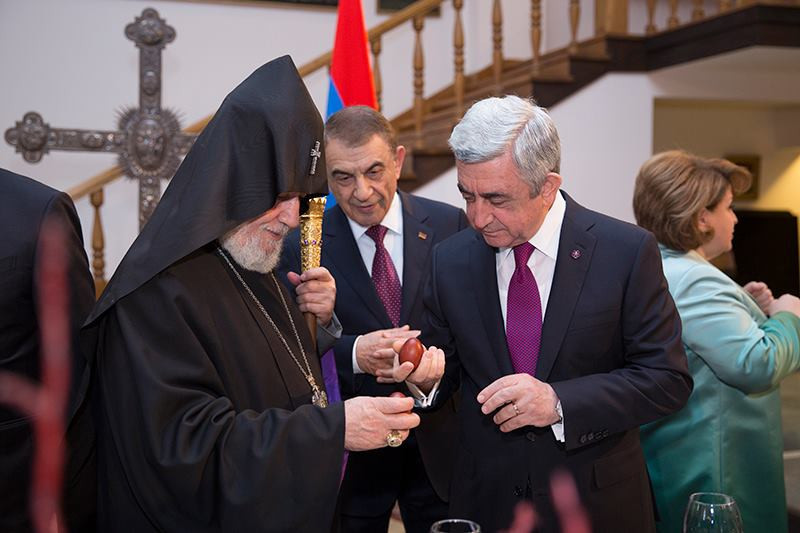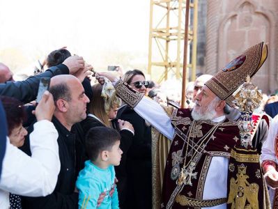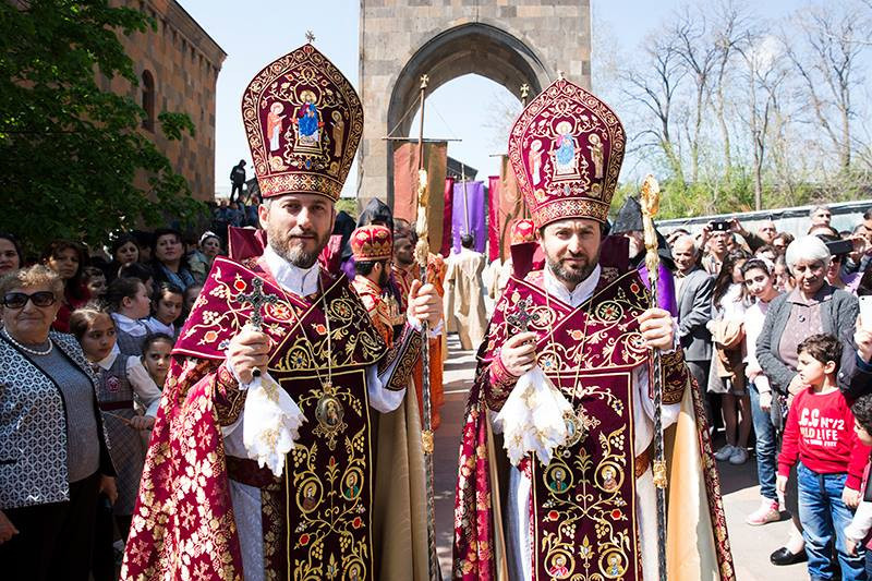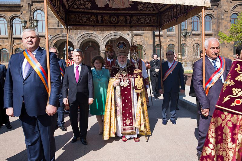 With the joyful tidings of the glorious Resurrection of our Lord, Jesus Christ, we greet His Holiness, Aram I, Catholicos of the Great House of Cilicia; the Armenian Patriarch of Jerusalem, Archbishop Nurhan Manoogian; we pray for the bedridden Armenian Patriarch, Archbishop Mesrop Moutafian. With love in Christ we greet the heads of our Sister Churches and to their faithful. With pontifical blessings we greet the President of Armenia, His Excellency Serzh Sargsyan and the first lady present here today for the Divine Liturgy, the president-elect His Excellency Mr. Armen Sarkissian. We extend our greetings to President Bako Sahakyan of the Republic of Artsakh; the state officials of Armenia and the representatives of diplomatic missions accredited in Armenia. We bestow our pontifical love and blessings on all our clergy and our faithful people, in Armenia and in the Diaspora.