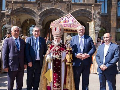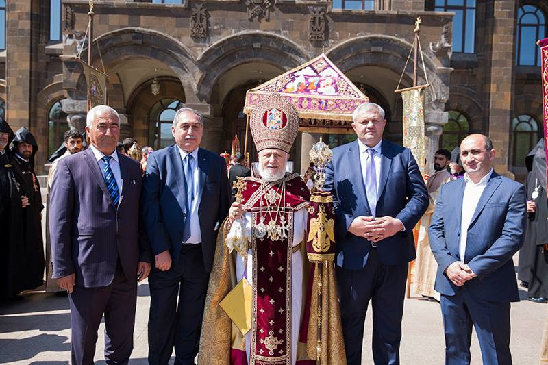 This year the Pontifical Canopy Bearers were: Presidential Adviser Mr. Felix Pirumyan; Mr. Mamikon Aslanyan, Mayor of Vanadzor; Mr. Karen Eghiazaryan, Mayor of Aparan; and Mr. Babken Vardanyan, community leader of Sardarapat. Their choice was made on the occasion of the 100th anniversary of the May Heroic Battles to be celebrated this year.