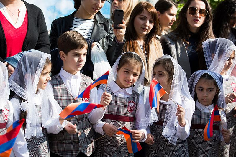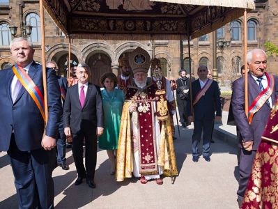 The sacred ceremony began with the Ecclesiastical procession, which processed the Catholicos of All Armenians; Mr. Serzh Sargsyan, President of the Republic of Armenia and Mrs. Rita Sargsyan to the Mother Cathedral. In front of the St. Trdat Arch and the Mother Cathedral Bell-tower, the Ecclesiastical procession was greeted with applause by numerous pilgrims who had travelled to the Mother See on the occasion of the Feast. Among them were also members of the AGBU Yerevan Scout Group and students of the Eurnekian public school