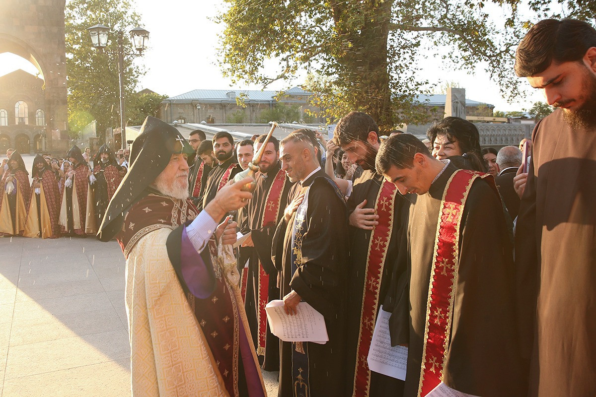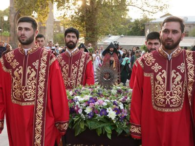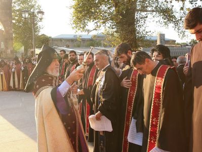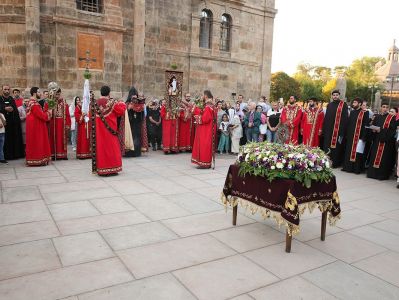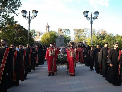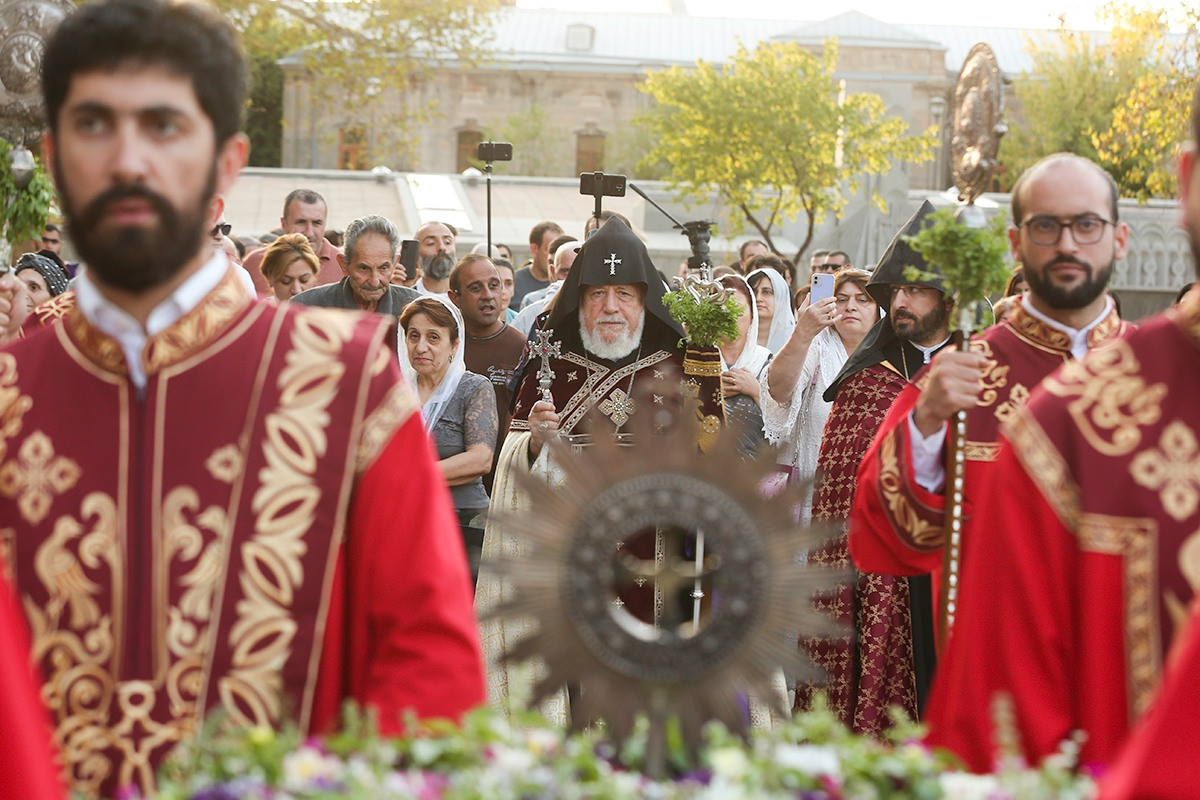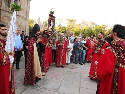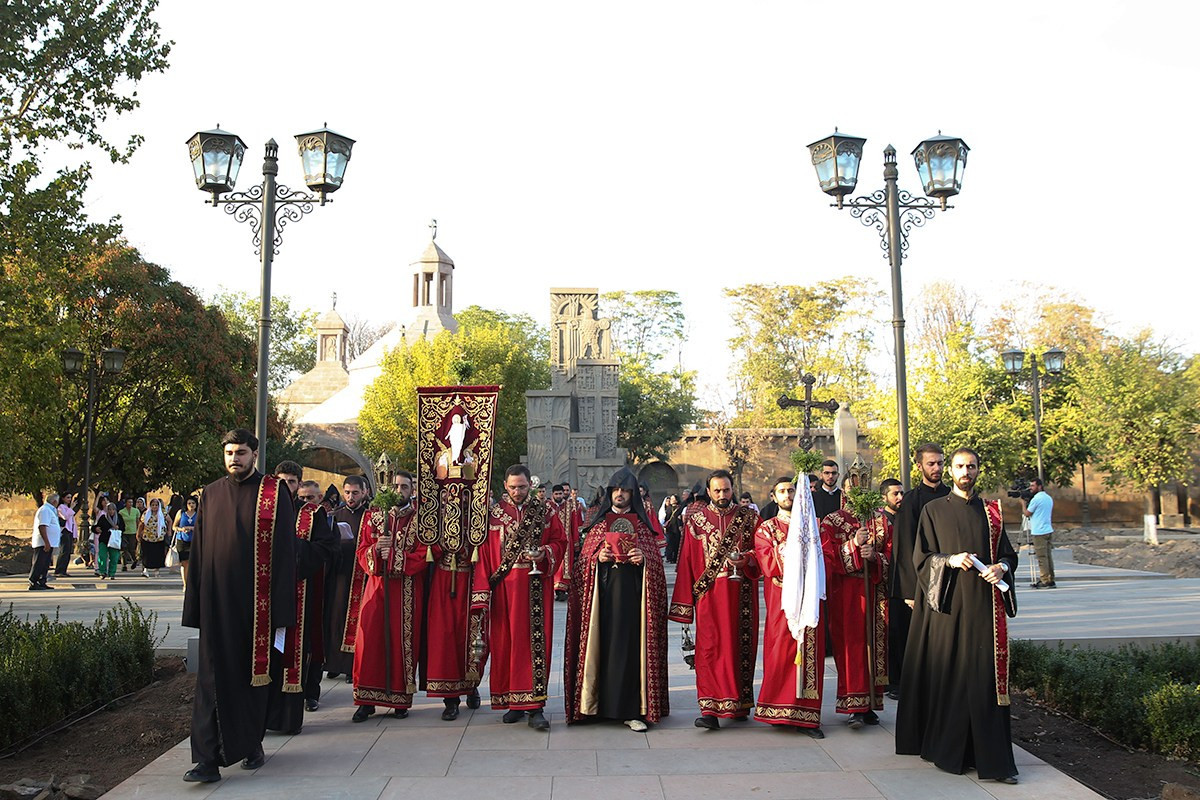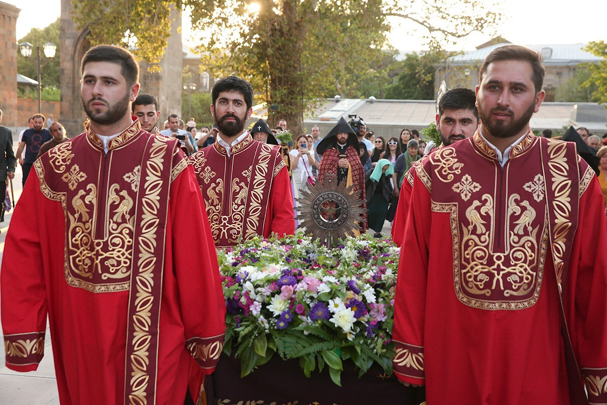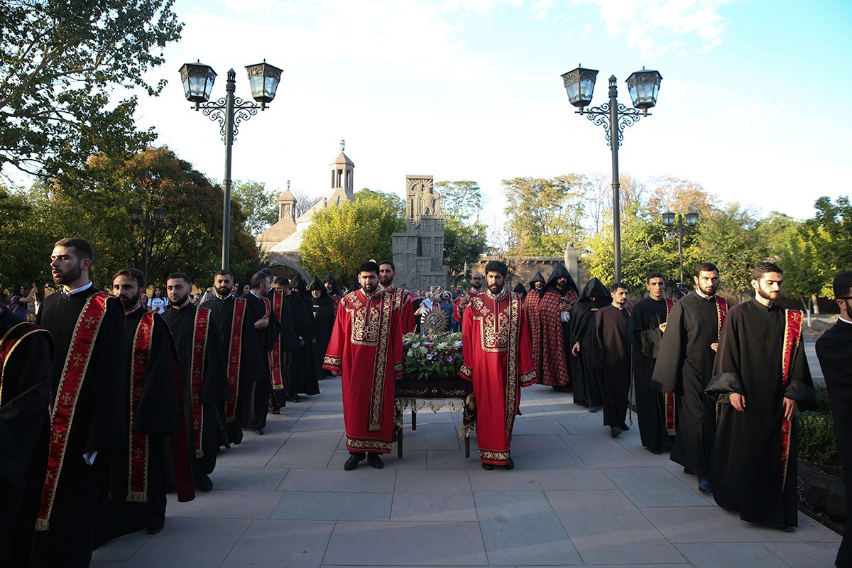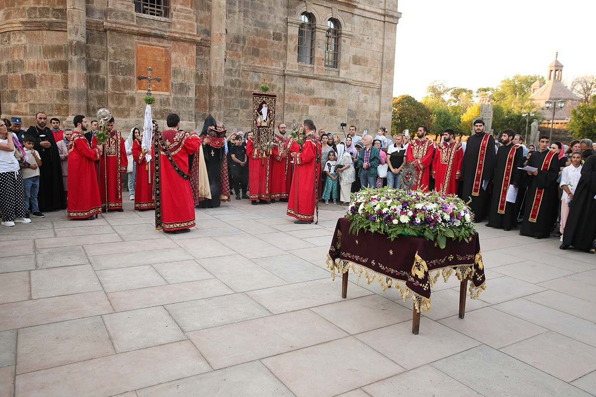 Following the Evening Service, under the patronage of His Holiness Karekin II, Supreme Patriarch and Catholicos of All Armenians; the solemn procession of the Exaltation of the Holy Cross took place in the courtyard of the Mother Cathedral. On that occasion, the reliquary enclosing the relic of the Holy Cross was brought out for the worship and consolation of the faithful. The Andastan service was also held, during which the Patriarch of All Armenians blessed the basil decorating the cross and the four corners of the world.