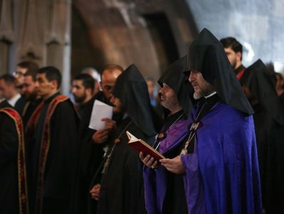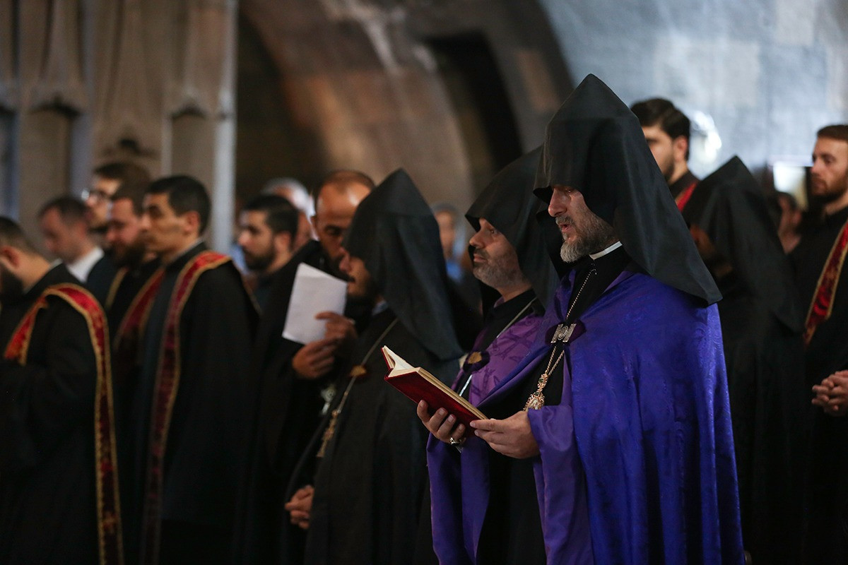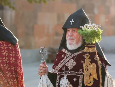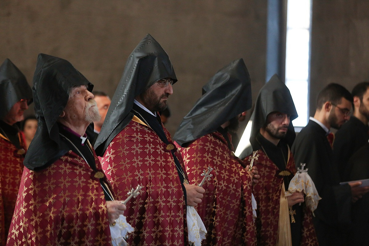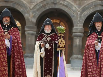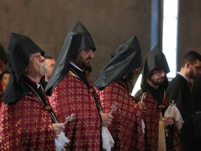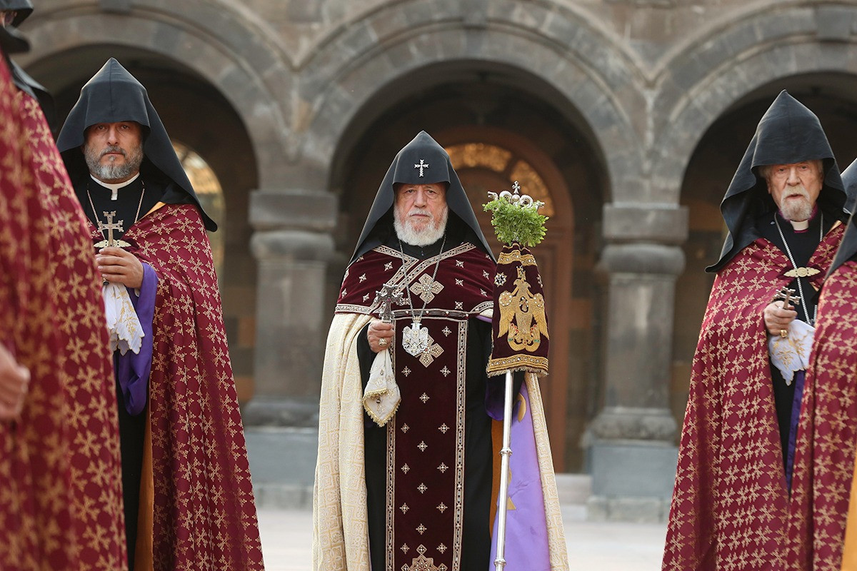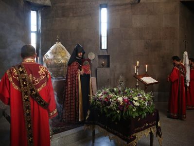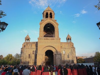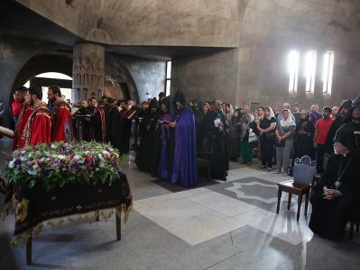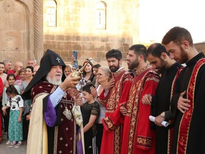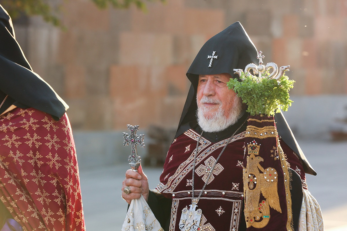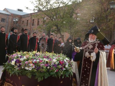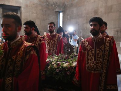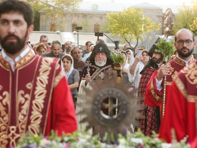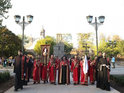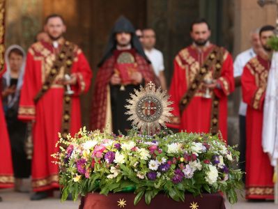 Following the Evening Service, under the patronage of His Holiness Karekin II, Supreme Patriarch and Catholicos of All Armenians; the solemn procession of the Exaltation of the Holy Cross took place in the courtyard of the Mother Cathedral. On that occasion, the reliquary enclosing the relic of the Holy Cross was brought out for the worship and consolation of the faithful. The Andastan service was also held, during which the Patriarch of All Armenians blessed the basil decorating the cross and the four corners of the world.