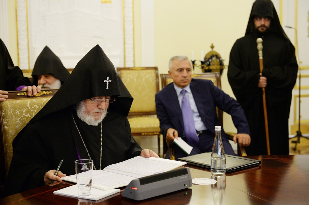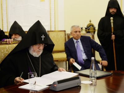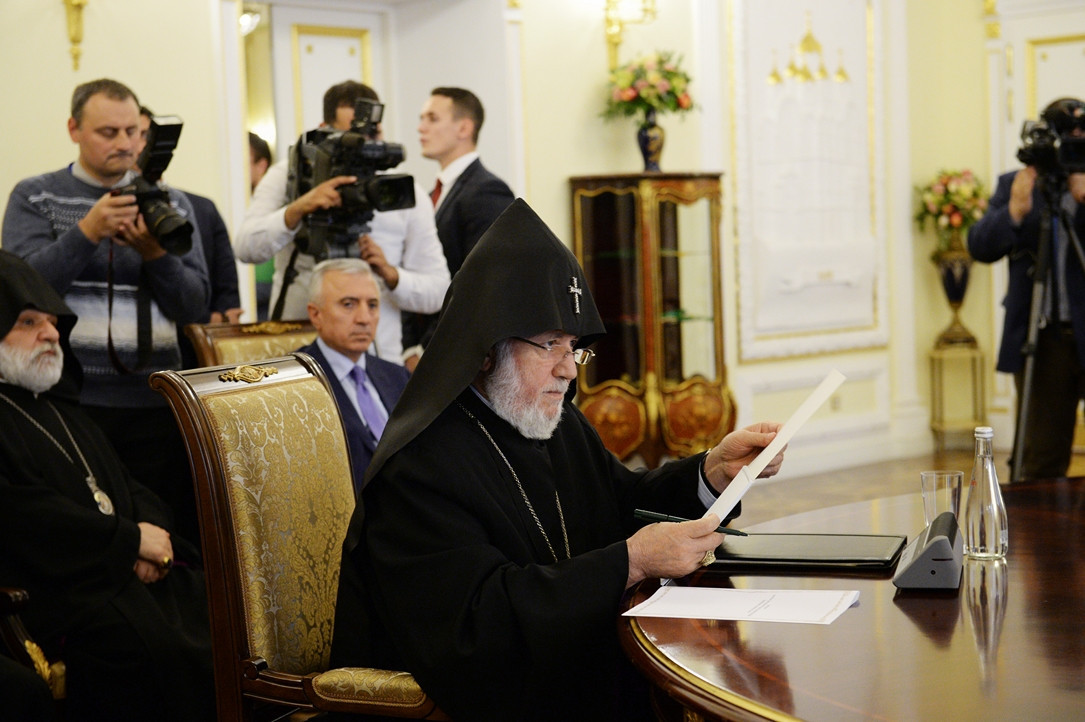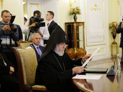 During the trilateral meeting, His Holiness Karekin II, Supreme Patriarch and Catholicos of All Armenians conveyed his remarks to His Holiness Kirill I, Patriarch of Moscow and All Russia and Sheikh ul-Islam Allahshukur Pashazade.