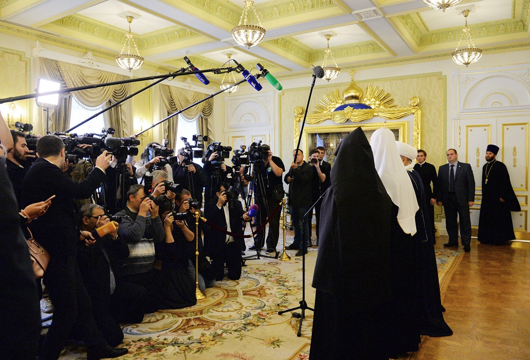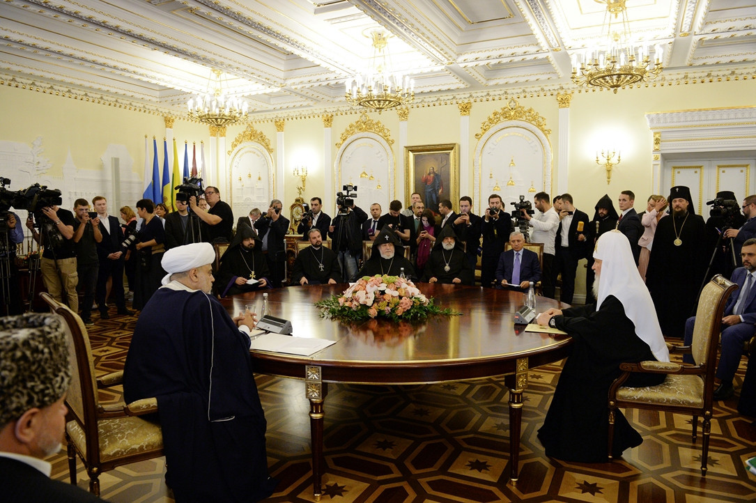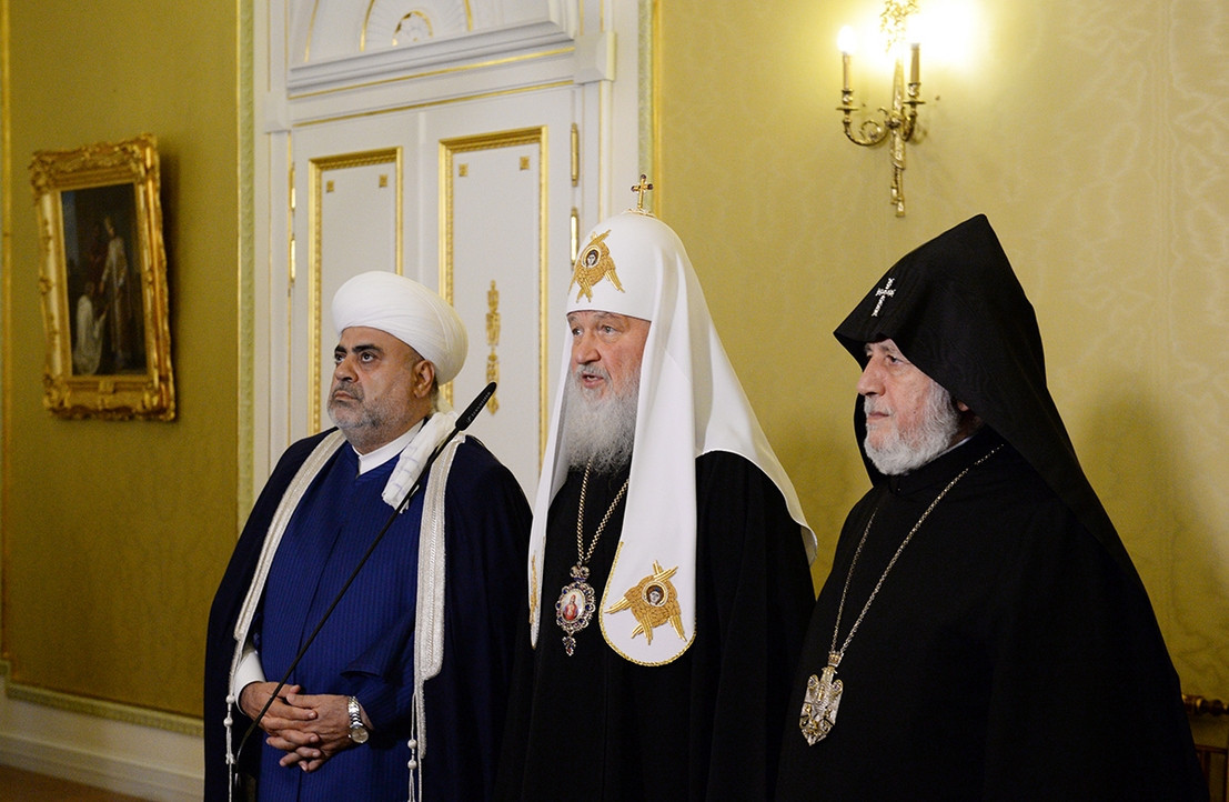 We welcome you at this regular meeting of the regional spiritual leaders, which became possible due to the steady mediation efforts of our spiritual brother Patriarch Kirill. Six years have passed since our last meeting in this format, which took place in Yerevan in November 2011, convened on the occasion of the Presidium meeting of the CIS Interreligious Council.