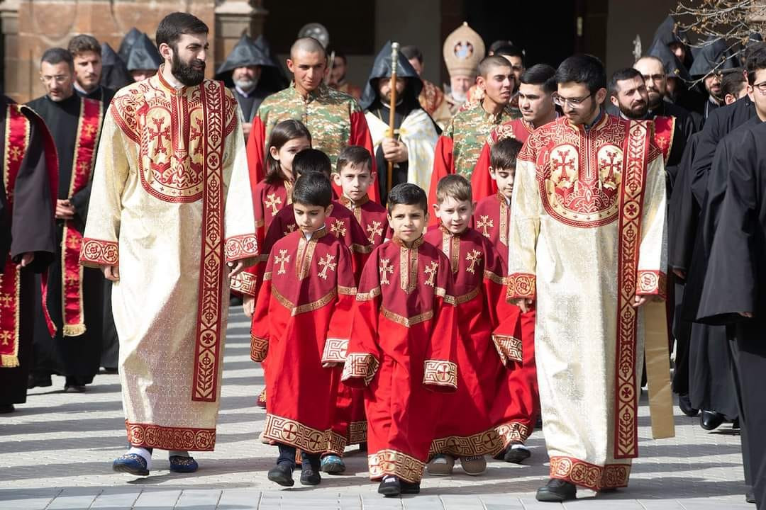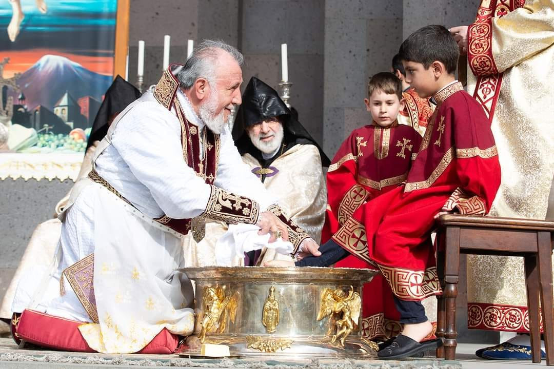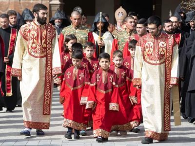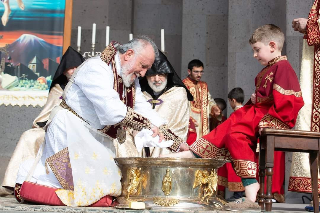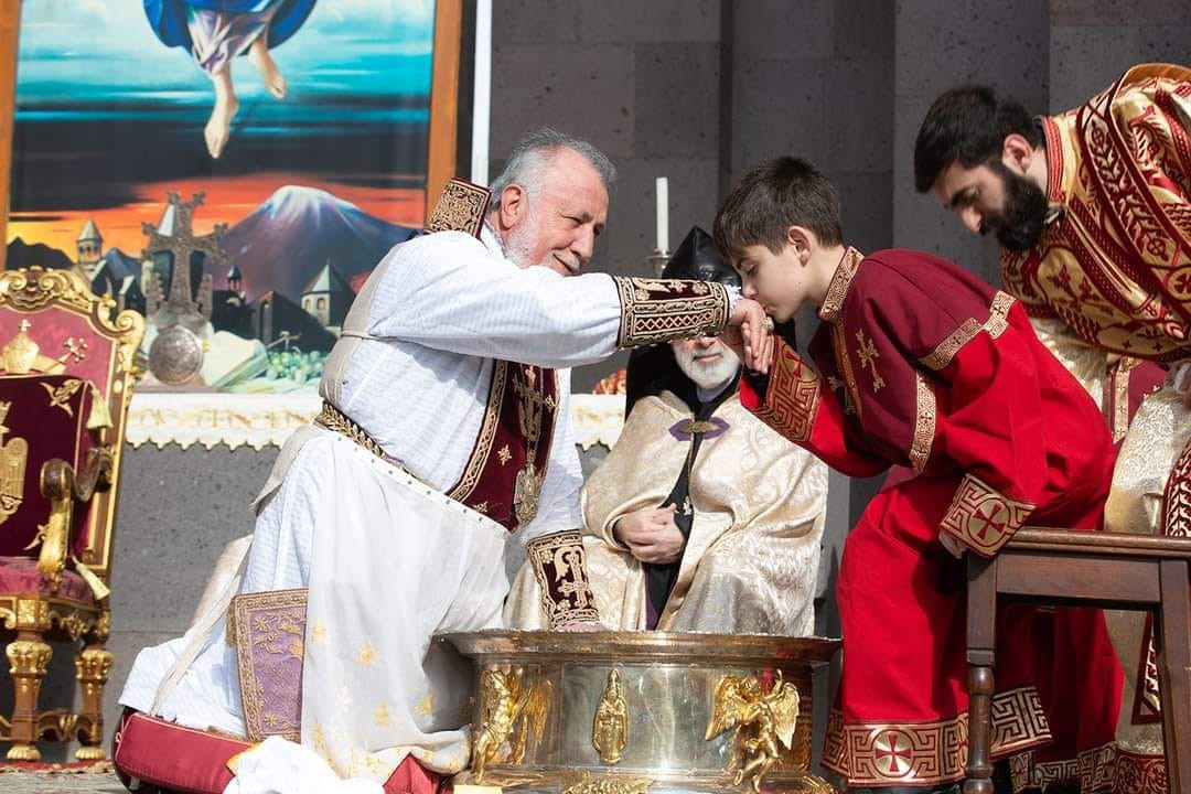 Afterward, under the singing of the hymns, following the example of Jesus Christ, His Holiness knelt on the bema before the Holy Altar and washed the feet of the members of the Brotherhood of the Mother See: His Grace Bishop Daniel Fntgyan; Dn. Garik Kadeyan; Dn. Anushavan Asatryan; Rev. Fr. Archimandrite Zatik Papikyan, member of the Armenian Patriarchate of Constantinople; Dn. Narek Temuryan, student of the 6th Auditorium of the Gevorkian Theological Seminary; conscripts of the N military unit of the RA Defense Ministry Vram Atoyan and Samvel Aslanyan; students of the "Eurnekyan" public school Felix Arakelyan and Suren Movsisyan, Ashot Asatryan student of the “Kyurkjian” Children's Support Center of the Mother See, as well as other children’s feet- Robert Alikhanyan, George Karayan, Hayk Sargsyan and Levon Kesablian.