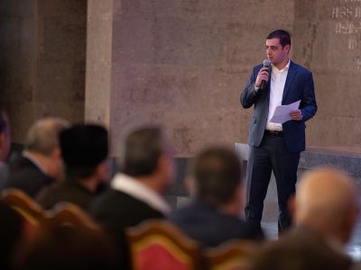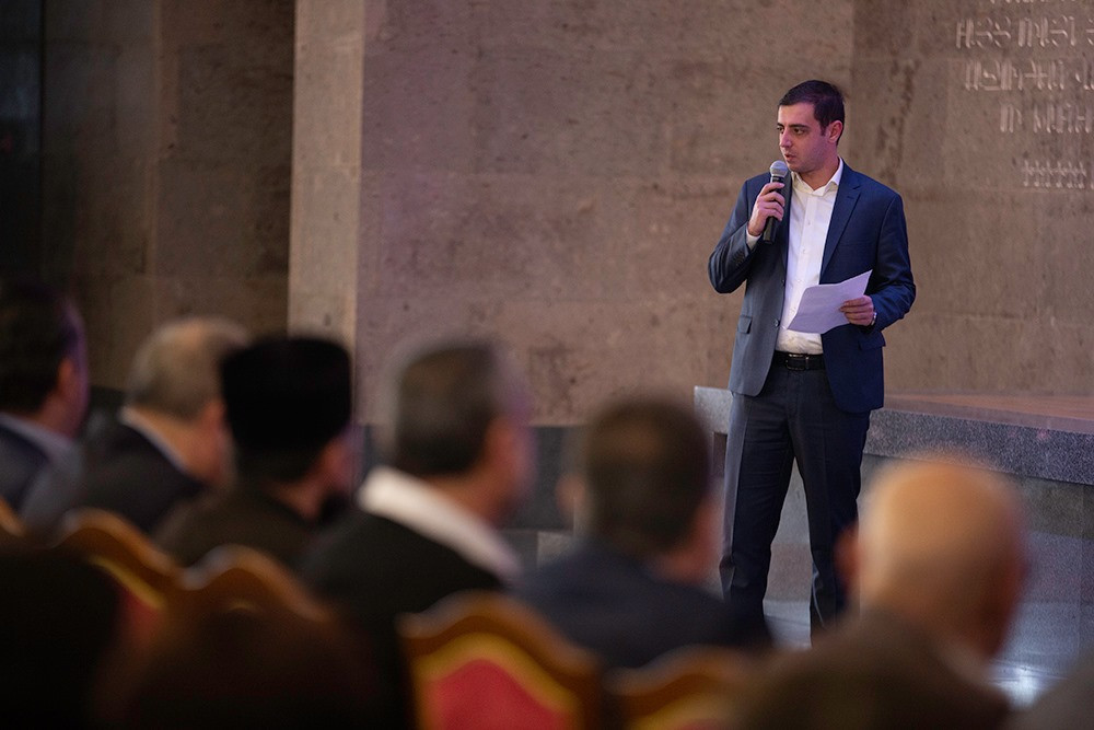 Պաշտոնեության անունից Վեհափառ Հայրապետին նաև շնորհավորական խոսք ուղղեց Մայր Աթոռի հովանու ներքո գործող «Քյուրքչյան» երեխաների աջակցության կենտրոնի տնօրեն Արամ Մկրտչյանը: