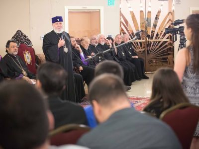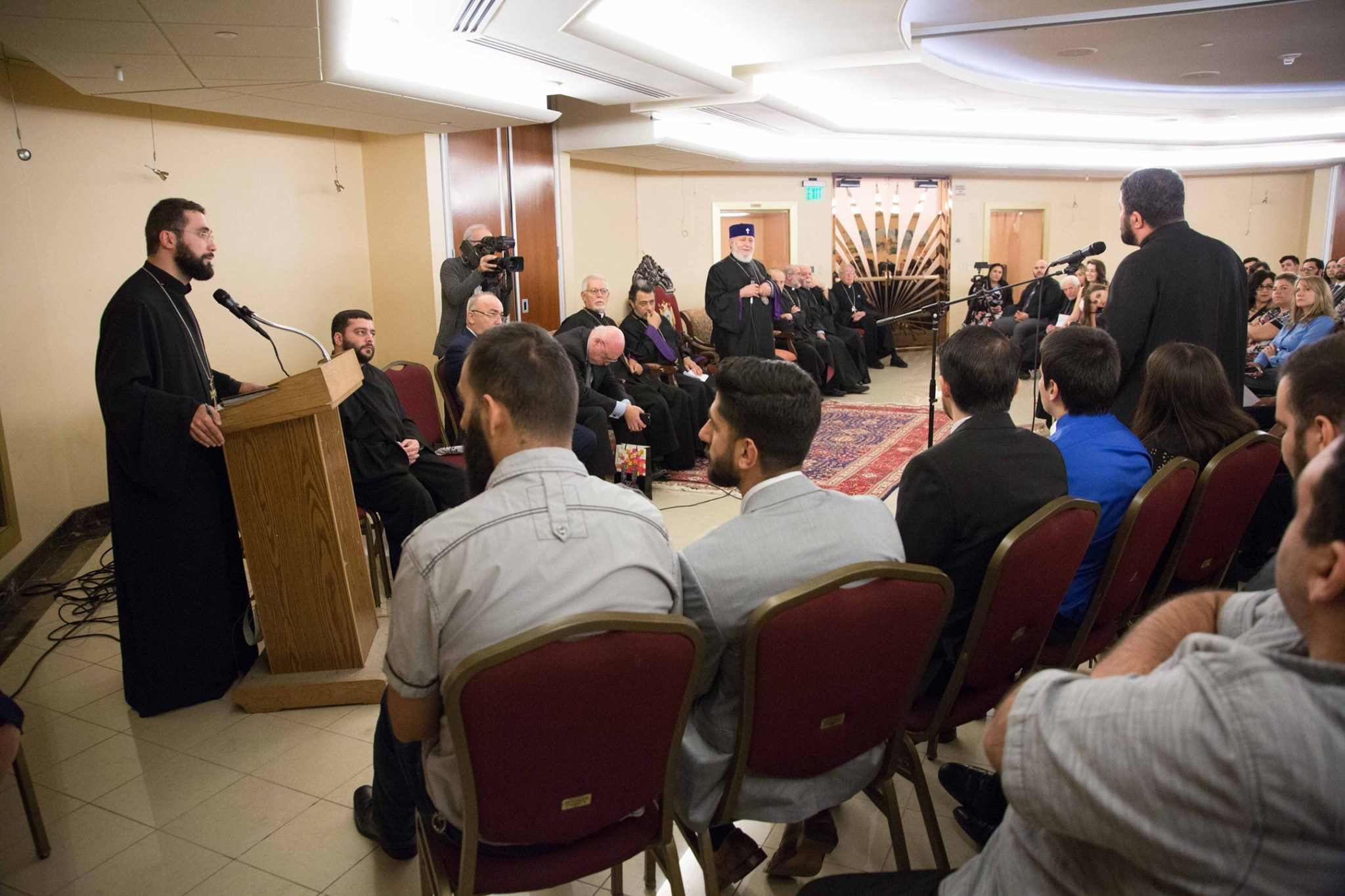 Վեհափառ Հայրապետ- Տոնախմբում ենք ԱՄՆ-ում Արևմտյան թեմի հաստատումը: Իննսուն տարի առաջ մեր ժողովրդի զավակունք ջարդերից մազապուրծ՝ կայք հաստատեցին Միացյալ Նահանգներում: Նրանք այստեղ կառուցեցին եկեղեցիներ, դպրոցներ, ազգային հաստատություններ, որպեսզի իրենց զավակները մեծանան՝ պահպանելով ազգային ոգին, գիտակցությունը և այդ ավանդները փոխանցեն սերնդից սերունդ: Բնական է, որ ժամանակի մեջ պետք է ունենայինք նաև կորուստներ՝ լեզվի, մշակութի և ոգու: Բայց փառք ենք տալիս Աստծուն, որ այդուհանդերձ՝ թեմը մեծացել և զորացել է: Այս նոր իրավիճակում պետք է կարողանանք վերարթնացնել ազգային ինքնագիտակցությունը: Հայ երիտասարդները պետք է գիտակցեն, որ իրենք հայ ազգի, հայ եկեղեցու զավակներ են և անձնական ներդրում ու առաքելություն ունեն ազգային կյանքում: Եվ, որ այս երկրում հայ ազգի շարունակականությունը պայմանավորված է նաև իրենց անձնական ներդրումով: Հայերեն սովորելու նախանձախնդրությունն է պետք արթնացնել հայ երիտասարդի մեջ: Ազգային ոգու վերարթնացումը կարող ենք իրականացնել ոչ միայն այստեղ ազգային կառույցներ ձևավորելով, նաև մայր հայրենիքի հետ նրանց կապը ապահովելով: Հայաստան կատարած մեկ այցը ոգեփոխություն է առաջ բերում հայ երիտասարդի մեջ: Հայաստան գալը ներշնչման աղբյուր է, ազգային ինքնության բացահայտման բացառիկ հնարավորություն յուրաքանչյուրի համար: Դուք լիարժեքորեն մեր ազգային ժառանգության և ավանդների կրողն եք, մնացեք հաղորդ, ներգրավված եկեղեցական, ազգային կյանքին և ձեր հոգին կբացվի, ձեր գիտակցությունը կզորանա և կլինեք ազգի արժանավոր զավակներ: