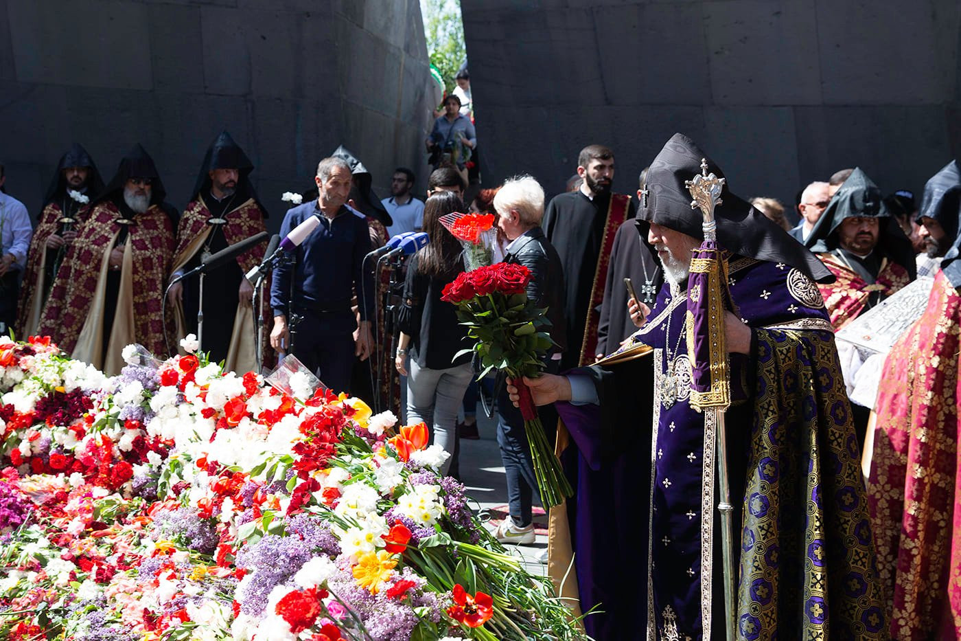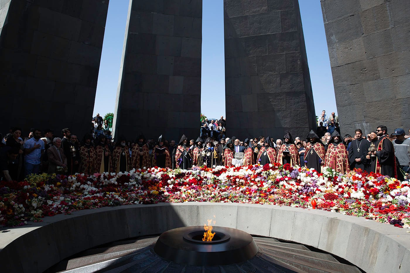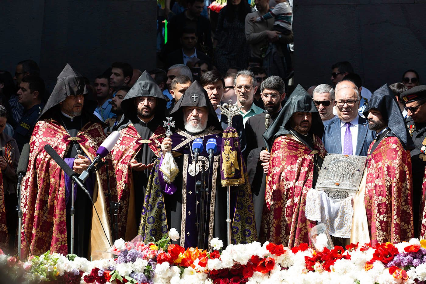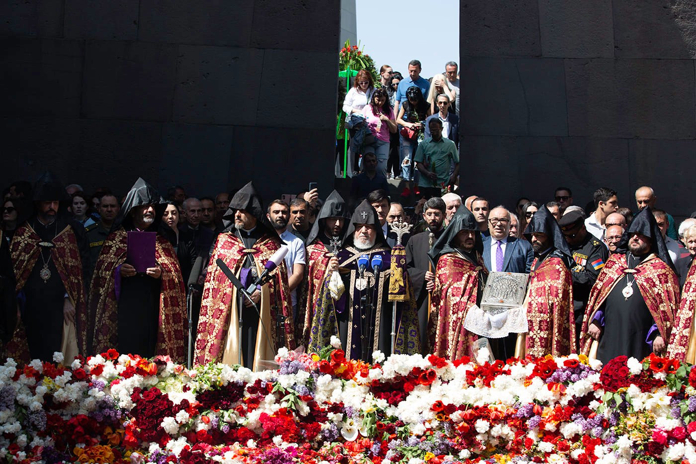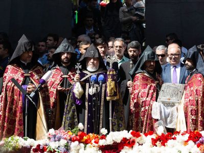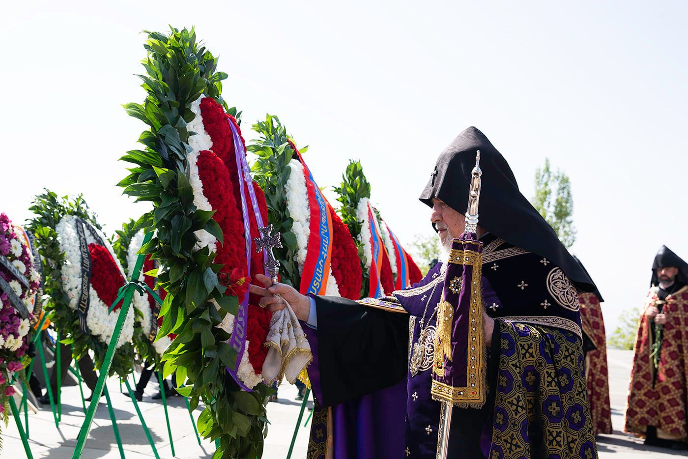 Ծաղկեպսակի զետեղումից հետո հուշահամալիրում՝ անմար կրակի առջև, Վեհափառ Հայրապետի նախագահությամբ կատարվեց Հայոց Ցեղասպանության սուրբ նահատակների բարեխոսական կարգ: