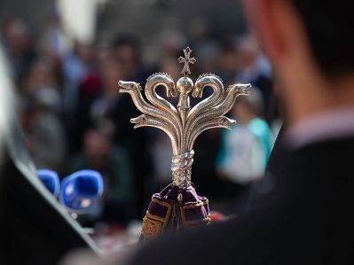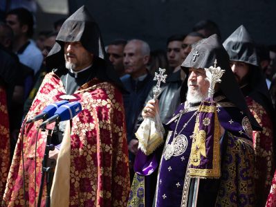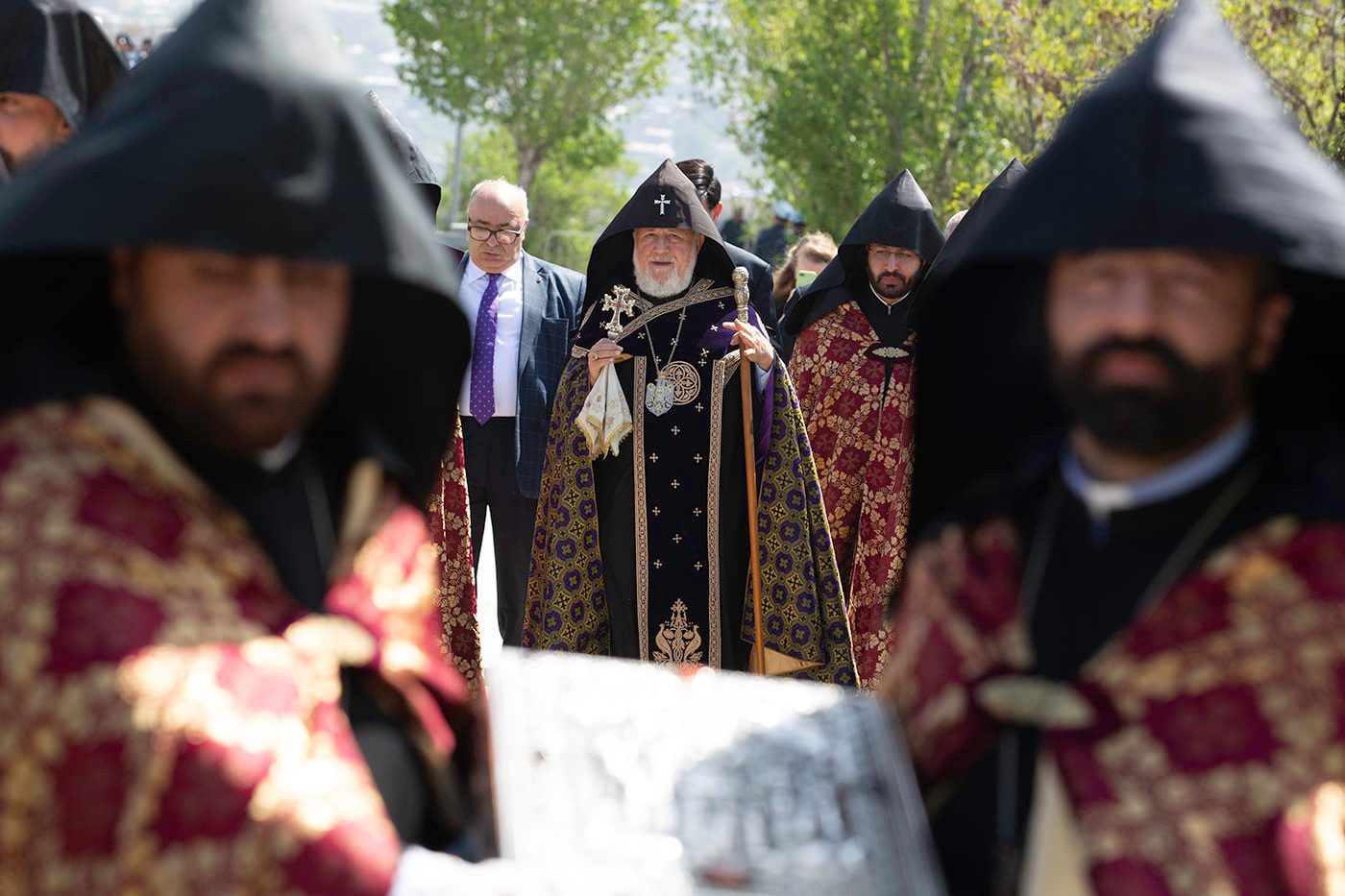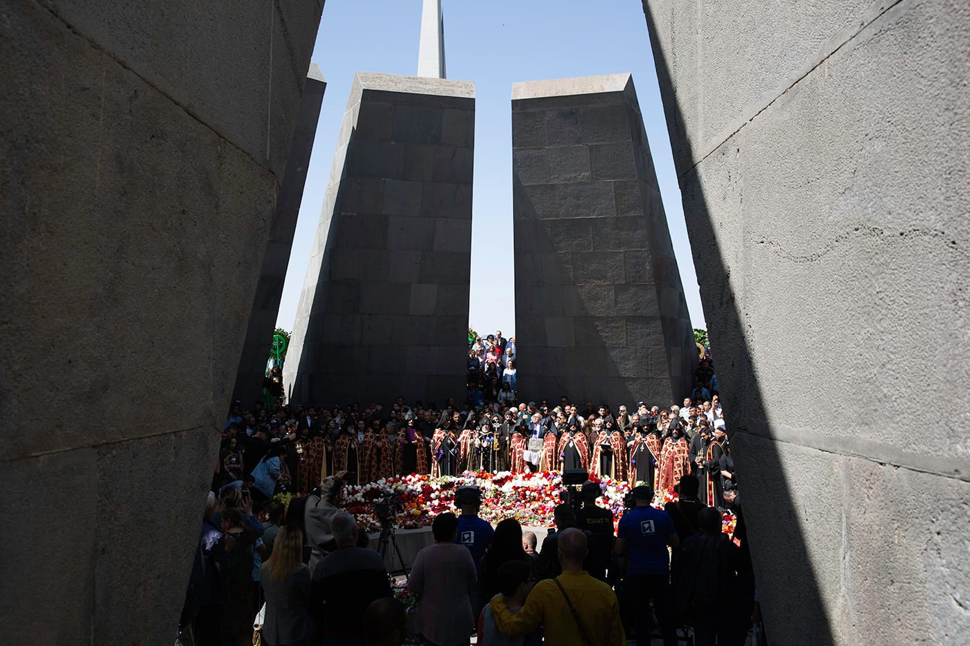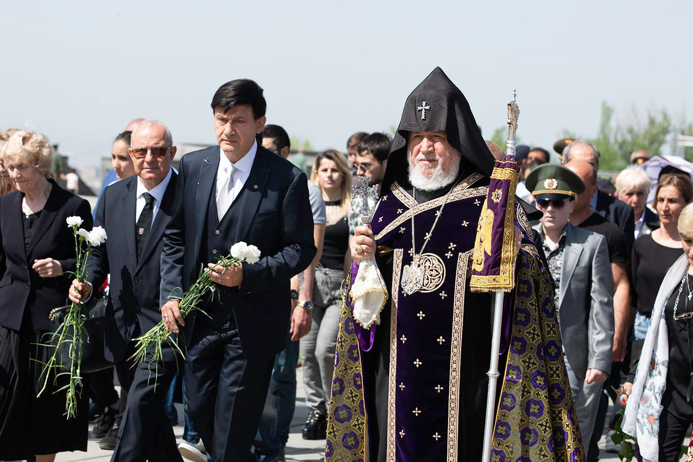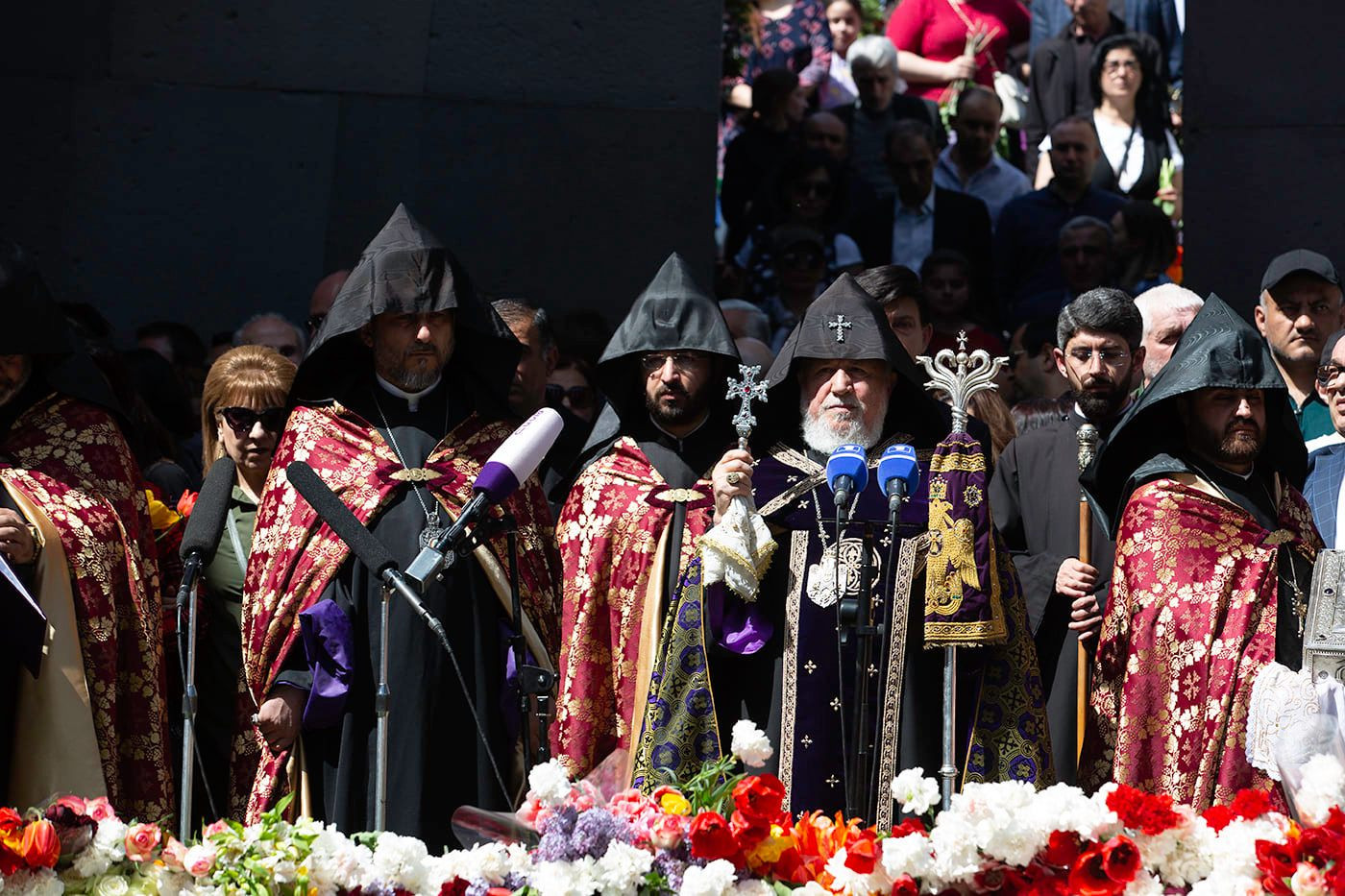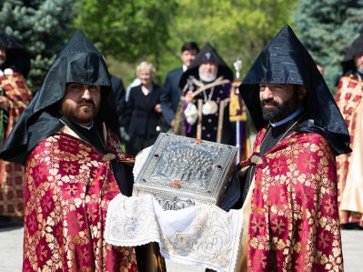 Ծաղկեպսակի զետեղումից հետո հուշահամալիրում՝ անմար կրակի առջև, Վեհափառ Հայրապետի նախագահությամբ կատարվեց Հայոց Ցեղասպանության սուրբ նահատակների բարեխոսական կարգ: