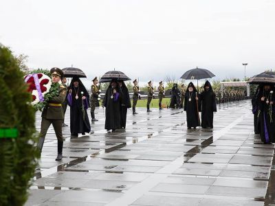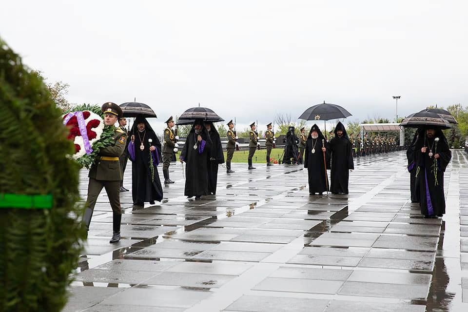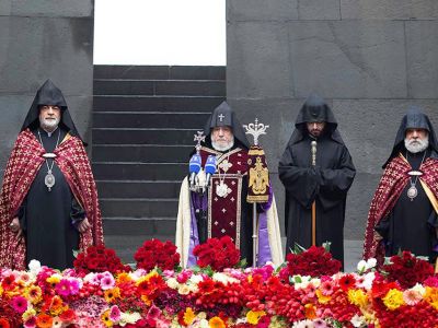 Ծաղկեպսակի զետեղումից հետո հուշահամալիրում՝ անմար կրակի առջև, Վեհափառ Հայրապետի նախագահությամբ կատարվեց Հայոց Ցեղասպանության սուրբ նահատակների բարեխոսական կարգ: