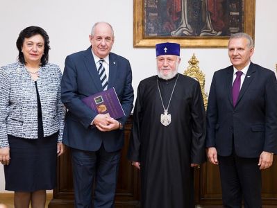 Այնուհետև Վեհափառ Հայրապետը ողջունեց հյուրերի այցը Մայր Աթոռ Սուրբ Էջմիածին՝ նշելով, որ նման գործակցության համար ամուր հիմք են ծառայում դարերով ձևավորված սերտ հարաբերությունները: Նորին Սրբությունը կարևորեց պատմական հանգամանքների բերումով տարբեր երկրներում ապաստան գտած հայ և հույն ժողուրդների զավակների նկատմամբ դրսևորվող հոգատարությունը, ինչը կնպաստի սփյուռքի առջև ծառացող արդի մարտահրավերների հաղթահարմանը և ազգային ինքնության պահպանմանը: