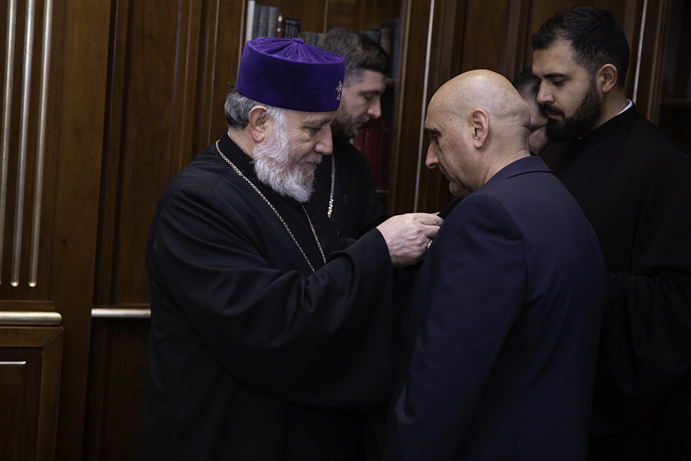 Սրբատառ կոնդակի ընթերցումից հետո Վեհափառ Հայրապետը Հայ Եկեղեցու շքանշանով զարդարեց մեծարյալի կուրծքը: